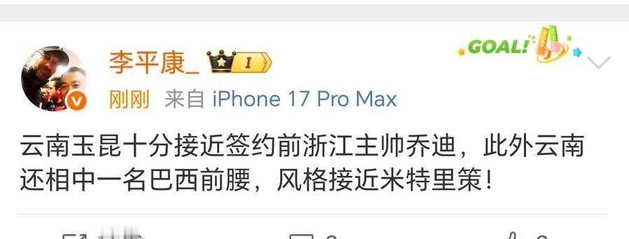 知名足球媒体人李平康:前浙江主帅乔迪十分接近签约深圳新鹏城。另外云南玉昆相中一名