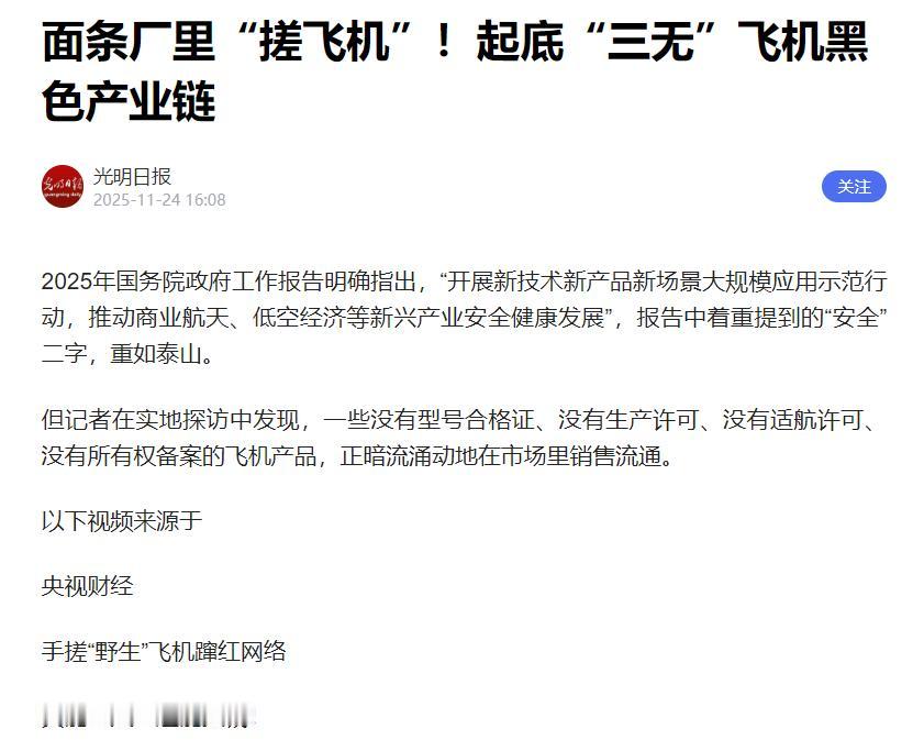 这一刻“工业克苏鲁”具象化了!央视披露了一件“面条厂出售自制飞机”的“奇案”,网友称:中国的战争潜力太可怕了! 11月23日晚,央视财经《财经调查》栏目曝光了一桩让人瞠目结舌的事:在山东滨州邹平市魏桥镇,一家主营面条生产的工厂里,竟然藏着个飞机制作工作室。 记者按线索找到卖家老周时,进门先看到的是堆积如山的包装面条,转头才发现另一侧车间里摆着三架正在组装的旋翼飞机,机身蒙着灰尘,部分螺丝都已生锈。 老周直言,做面条的机床和造飞机的能通用,于是拉上几个人兼职搞起了飞机定制,从配件到整机全靠自行改装,连个正经的生产标准都没有。 更让人捏把汗的是,这些飞机既没有型号合格证,也没有生产许可和适航认证,试飞场地竟是农田里开辟的临时道路,而负责试飞的老周本人,连飞行执照都没有。 这事曝光后,邹平市委、市政府连夜成立了由发改、市场监管、公安等多部门组成的联合调查组,直奔现场展开全面调查,并表示会依法依规严肃处理,同时在全市范围举一反三排查类似问题。 其实这类民间“手搓飞机”并非个例,记者在二手交易平台发现,不少卖家打着“爱好制作”的旗号公开售卖自制飞机,售价从八万到几十万不等。 必须说,这种无资质制造销售载人飞机的行为,简直是拿生命当儿戏,安全隐患大到没边,相关责任人确实该被严肃追责。 但换个角度想,一个面条厂老板没受过专业航空教育,仅凭兴趣就能用面条机床捣鼓出能上天的旋翼机,这事儿本身就透着股魔幻又硬核的味道,而这种在理性工业体系下暗涌的、人力技术难以匹敌的产业潜力,着实让人震撼。 要知道,从机床通用到配件自制,从零散工作室到隐秘交易链条,民间爱好者能把“造飞机”这种高精尖活儿玩出“家常菜”的感觉,背后正是中国制造业几十年积累的完整产业链在托底。 小到螺丝零件,大到通用设备,普通人想找齐造飞机的基础材料并不费劲,这种“万物皆可造”的工业底气,可不是随便哪个国家都有的。 网友调侃的“战争潜力太可怕”虽有些夸张,但也恰恰说明了,庞大的工业体系渗透到民间毛细血管,连面条厂都能跨界触碰航空门槛时,这种深不可测的产业韧性,正是“工业克苏鲁”最鲜活的注脚。