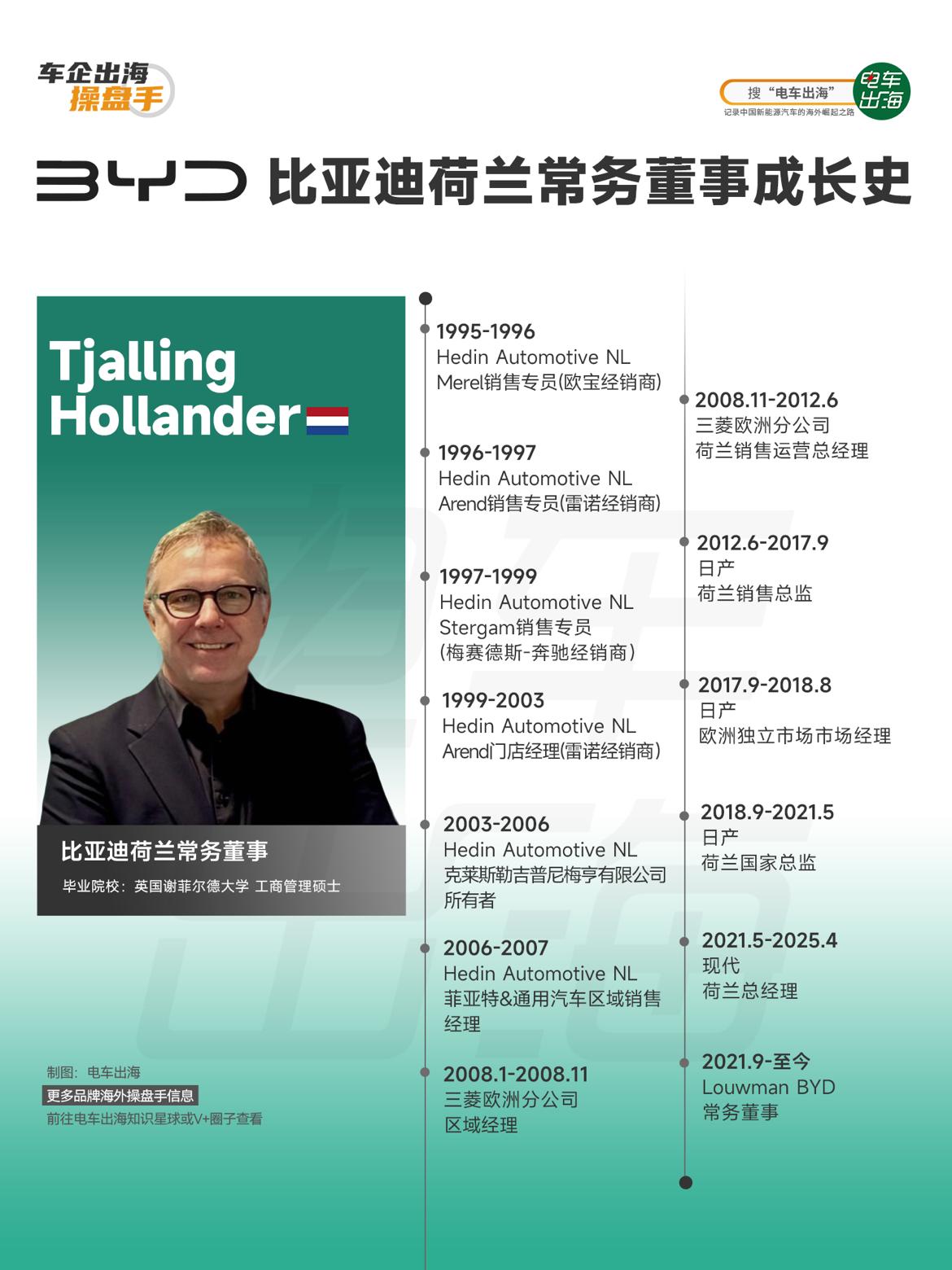 Tjalling Hollander的职业起点非常“接地气”:在荷兰的经销体系里做一线销售,从欧宝、雷诺、奔驰一直做到门店经理。你能想到的销售端细节,他基本都经历过。 也正因为这种从底层往上爬的路径,他对荷兰乘用车市场的零售体系、经销商结构、消费者情绪,都有非常实际的理解。 进入 2000 年代后,他的轨迹开始切入主机厂体系——日产荷兰销售总监、独立市场市场经理,再到荷兰国家总监。对日产这种在欧洲份额不算高、但体系感极强的品牌来说,要把一个国家的盘子运稳,需要既懂渠道又懂运营的人,他显然是这种复合型管理者。 他还曾在三菱欧洲总部担任荷兰销售运营总经理,这类岗位在欧洲主机厂体系里非常核心,属于要同时盯住销量、价格策略、寄售库存、经销网络的“综合调度者”。 更有意思的是,他还曾短暂创过业,做过克莱斯勒/吉普的零售业务,对零售端的风险、周转和现金流,他不是纸上谈兵,而是真摔过真干过。 而真正让他在新能源时代站上新舞台的,是 2018 年加入比亚迪荷兰,担任常务董事。那时候的比亚迪,在荷兰几乎没有存在感,更别谈乘用车业务。他属于最早一批把中国新能源品牌推入荷兰主流视野的人之一。 在他的带动下,比亚迪在荷兰的品牌形象和渠道扩张速度都明显提速,也为后来比亚迪在欧洲的大规模落地埋下基础。 2021 年之后,他又掌舵现代荷兰业务,同时仍然保持与比亚迪在欧洲网络的合作关系。现在,他在 Louwman BYD(比亚迪在荷兰的重要合作伙伴)担任常务董事,继续推动比亚迪在荷兰的乘用车网络建设。 他的职业经历横跨主机厂、经销集团、创业公司、中国品牌与韩国品牌,在荷兰汽车行业算是罕见的复合型人才。 大v聊车 电车出海操盘手