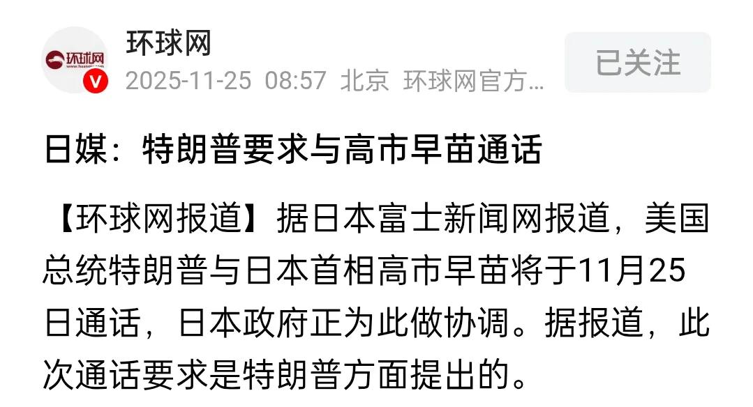 这边刚接了电话,在那边,特朗普马上就让日本给他打电话,你什么时候见过特朗普这么听话的? 现在最了解我军实力的就是美国,这就是特朗普听话听教的根源。 而日本因为自己统治需要,在岛内长期搞信息茧房,他们的民众压根不知道外面世界的样子,更不知道中国的实力,去外网看看你就知道,他们很多人真的以为中国还是甲午海战时的中国。 所以他们支持高市早苗,他们的产业几乎已经在崩盘的边缘,这是他们的一次赌博,他们希望高市早苗能赌赢。 所以,现在他们需要一个他们眼中有实力的人警告他们,特朗普这个电话应该就是转达警告的。 看日本未来几天的动向,如果不软下来,按中国的要求做,那就不得不雷霆一击了。