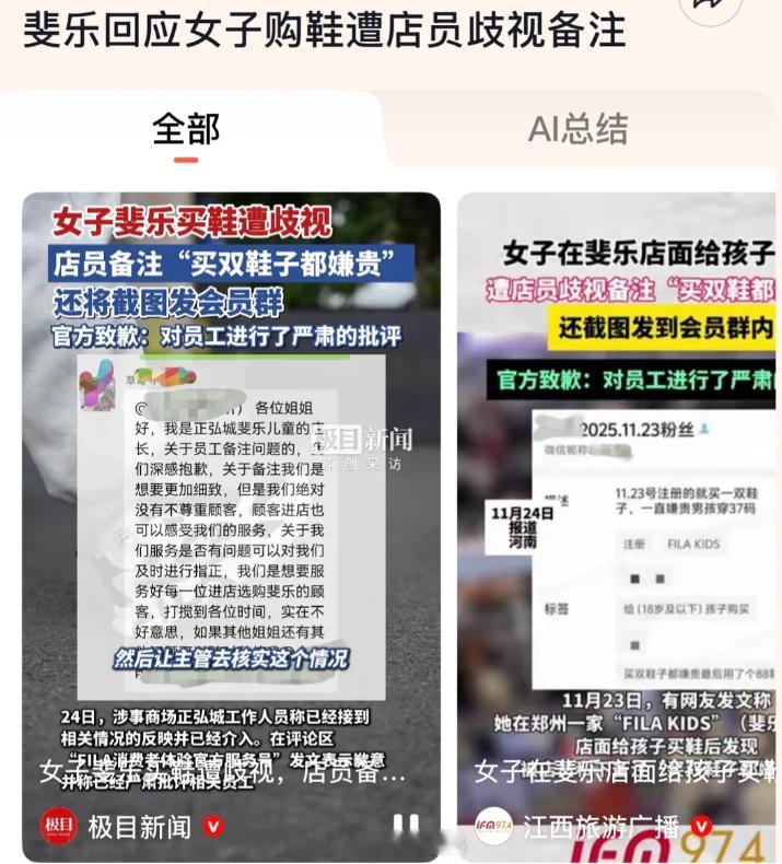 2025年11月24日商场和品牌方介入处理:涉事商场正弘城工作人员称已接到反映并介入,FILA消费者体验官方服务号在评论区致歉,称已严肃批评相关员工。2025年11月23日店长群内致歉并解散群聊:店长在群内称“深感抱歉,备注是想要更加细致,绝对没有不尊重顾客”,随后解散会员群。2025年11月23日顾客发现备注并质问:网友在会员群询问“就买一双鞋子有问题吗”,其他会员也对店员行为表达不满。2025年11月23日顾客买鞋被店员歧视备注:网友在郑州正弘城5楼FILA KIDS店给孩子买鞋,从进店到结账不到十分钟,试了三双鞋,被店员备注“买双鞋子都嫌贵”并截图发会员群