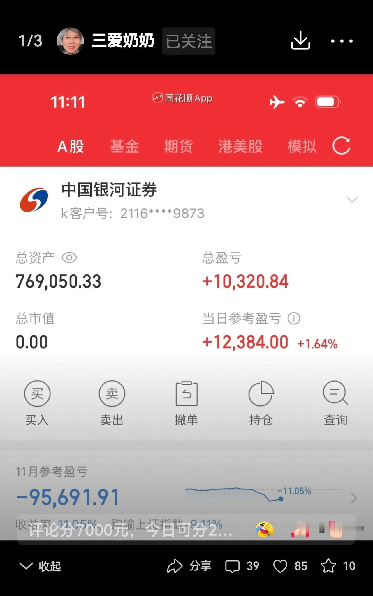 奶奶今日又盈利一万多,战绩颇为不错。下午奶奶又能建仓了。有网友说,这只股票还能涨,为何这么快就卖,如此炒股难怪会亏钱。 我想说,买卖股票的方式并无对错之分,只有适合自己的炒股方式。能赚到钱就是对的,亏了钱便是错的。大家说是不是这个道理? 今日大盘上涨,股民们应该都有所斩获了吧!
