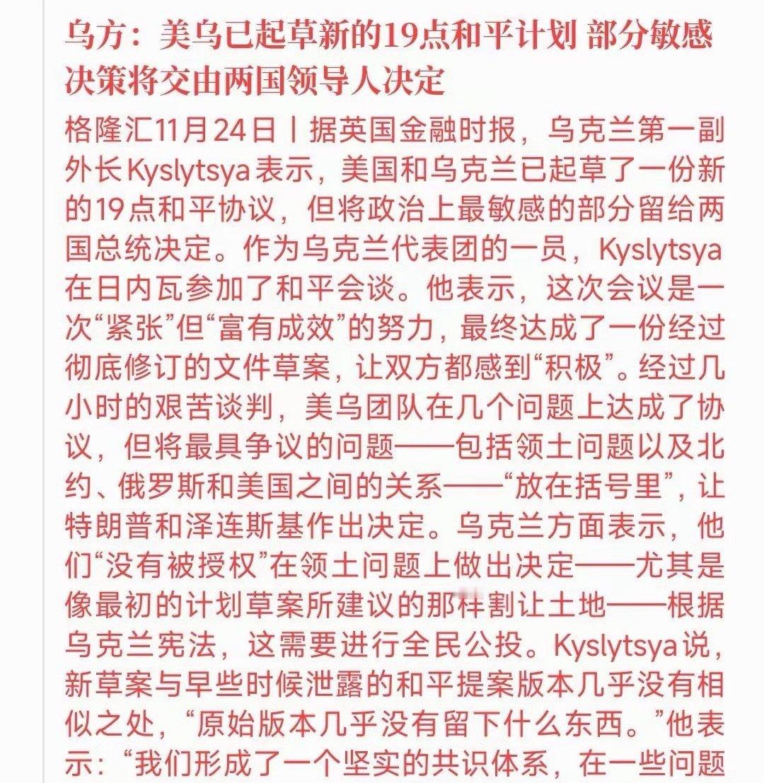 28点计划变19点计划,其中核心部分都被修复,大俄是否会同意呢?本来28点计划出现后俄已经同意去谈判了,但是经过乌和欧洲的修改后几大条款都变了味。1. 北约不扩张及乌克兰禁入北约变为了——模糊表述入约需北约成员国共识且目前无此共识。2. 承认克里米亚、卢甘斯克和顿涅茨克为俄罗斯实际领土,以及赫尔松和扎波罗热按接触线冻结现状等内容被删除了。——原来这个条款是俄最关心的3. 1000亿美元冻结俄资产用于美国主导的乌重建,美国获50%利润,欧洲另出1000亿美元被删除了——美国最关心的条款4. 乌克兰100天内大选变为了——和平协议签署后尽快举行选举。5. 乌克兰无故向莫斯科或圣彼得堡发射导弹则安全保障失效删除了6.所有冲突参与方获战争行为全面赦免且未来不索赔删除了7. 成立美俄安全问题联合工作组删除,——由美、乌、俄及欧盟共同参与的联合安全工作组。可以说新的19点计划把美俄的利益全部都删除了,反而欧洲的利益增加了不少,同时,乌的主权也拿回来一些,并保证了领导人的安全。
