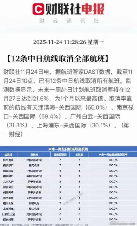 能回来的就赶紧回来吧,再晚就不好回来了。 在中方发出劝诫中国民众近期尽量避免去日本旅游的消息后,不少国人纷纷取消了赴日旅游。 除此之外,还有很多在日本的中国人也决定返回中国。 而前不久,中方又发出消息,12条中日航线取消全部航班,这就意味着以后想从日本来中国将会变得越来越困难。 其实说到底,中日关系现在闹得这么僵,高市早苗占了很大的责任。 众所周知,台湾问题一直就是我们自己的“家事”,可高市早苗却屡屡发出了不一样的声音。 这就好比一名母亲想让孩子回家,可邻居却拿着武器守在家门口去阻止孩子回到自己的家中。 可以这么说,如果日本继续是这种态度,那中方很有可能不再惯着他们。 航班取消或许只是一个开端,而不是结束,如果日本继续“搞事情”,中方不排除会有“刀剑相向”的可能性。