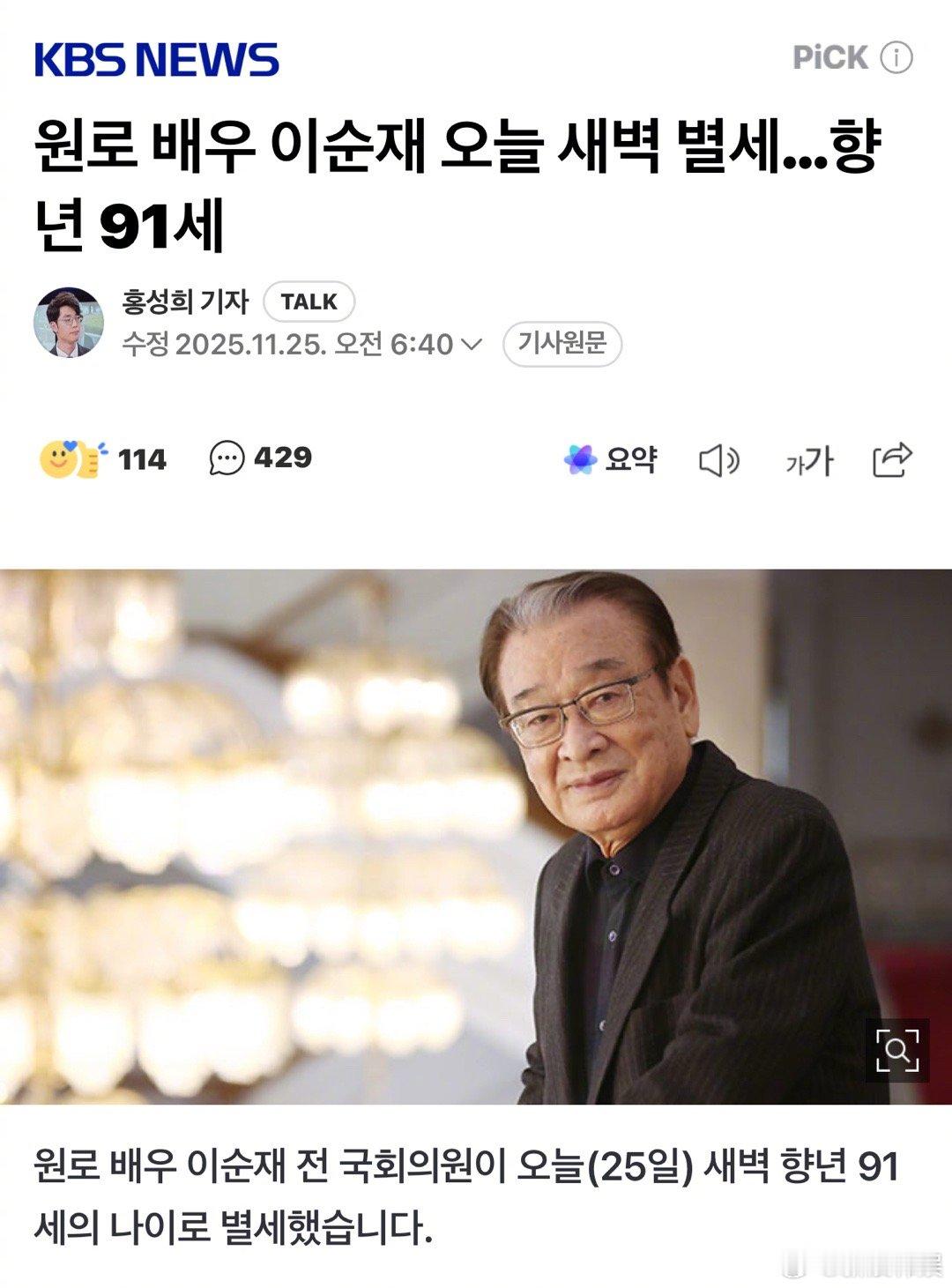 据韩媒,演员李顺载今日凌晨辞世,享年91岁。