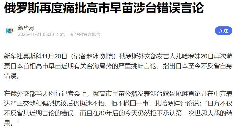 俄罗斯媒体突然放出一句硬话:中国要是被逼到动手,可能有人趁火跟上;可要是把挑衅者真打疼,反倒能换来尊重和安静。 近期,日本首相高市早苗的一番话算是把整个东亚局势搅得够热闹,她在国会上公然宣称,“台湾有事”可能构成日本能行使集体自卫权的“存亡危机事态”,这话明摆着是暗示可能武力介入台海,粗暴干涉中国内政。 即便中方多次提出严正交涉,高市早苗还嘴硬得很,在国会答辩时咬死这话符合日本政府立场,压根没打算撤回,而这波挑衅很快也引来了俄罗斯的强硬回应。 当地时间11月18日,俄罗斯外交部发言人扎哈罗娃在接受新华社记者专访时就直接点名警告,说高市早苗这类日本政客该好好反省历史,别玩火自焚。 没想到才过了两天,11月20日的俄外交部例行记者会上,扎哈罗娃又一次把这事摆上台面,痛批日本不仅不认错,80年后的今天连二战结果都不愿承认,还“厚颜无耻地”给台海局势添乱。 短短三天内连续两次表态,这在俄外交部的回应里可不算常见,足见俄方有多不满。扎哈罗娃还明确地重申,台湾是中国的一部分,这是中国内政,俄方肯定站中方这边。 俄罗斯这会儿站出来发声,不是单纯帮着中国说话,说白了还是日本自己把路走窄了,又正好撞在俄方的枪口上。 就拿南千岛群岛(日本称北方四岛)来说,高市早苗上台后就没停过嘴,一口一个那是日本“固有领土”,连下属措辞稍微缓和点都要被她严厉批评。 俄方自然也没惯着,不仅宣布禁止30名日本公民入境作为反制,还派图-95MS战略轰炸机带着战斗机绕着日本飞了11小时,把关键水道都绕了个遍,日本自卫队只能紧急升空跟踪,压根没敢拦。 更让俄罗斯警惕的是,日本最近还动起了修改“无核三原则”的心思。 这三原则是日本战后的核政策底线,明确说“不拥有、不制造、不运进”核武器,可高市早苗政府却琢磨着删掉“不运进”这条,想让美军把核武器带进日本。 俄罗斯可就在日本隔壁,周边出现核武部署可不是小事,要是朋友部署的那自然能放心,可日本的动作却是在俄方家门口埋隐患,俄罗斯是不可能接受的。 所以扎哈罗娃这两次表态,其实是一举两得:既明着给中国撑了腰,符合两国在主权问题上相互支持的立场;又借着谴责涉台言论的由头,把日本在北方四岛、军事化扩张这些事都敲打一遍。 日本想同时在中俄两边挑事,哪有这么便宜的买卖?俄方这波表态算是把话说透了,想靠挑衅刷存在感,迟早得被反制找上门。
