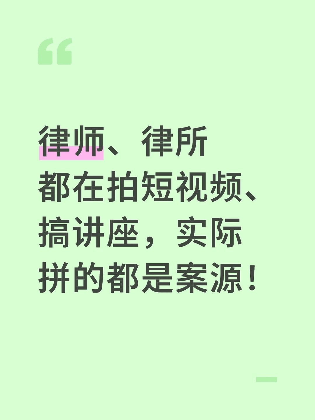 律师、律所都在拍短视频、搞讲座,实际拼的都是案源! 现在律师行业存在一个普遍的现象,那就是无论是大小律所,知名律所还是新兴律所,无论是小律师还是大律师、精英律师,年轻律师还是青壮年律师,非知名律师还是网红律师,女律师还是男律师,等等,全国大江南北的律师都在拍短视频,搞讲座,甚至有很多才艺型律师在拍法律短剧、高难度创意视频。 这么拼,实际上是在拼宣传,拼案源,拼生存。