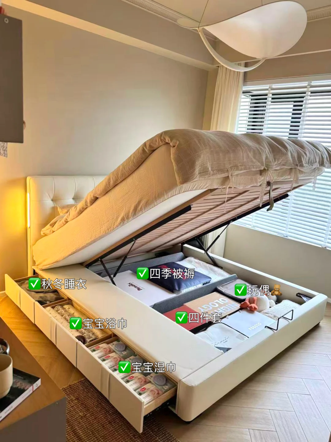 它的实用性完全超出我的预期,最惊喜的是储物能力,超大箱体空间太能装了,掀开床板,映入眼帘的是他家升级的7D网布床箱+实木底板保护衣物不勾丝不会受潮;