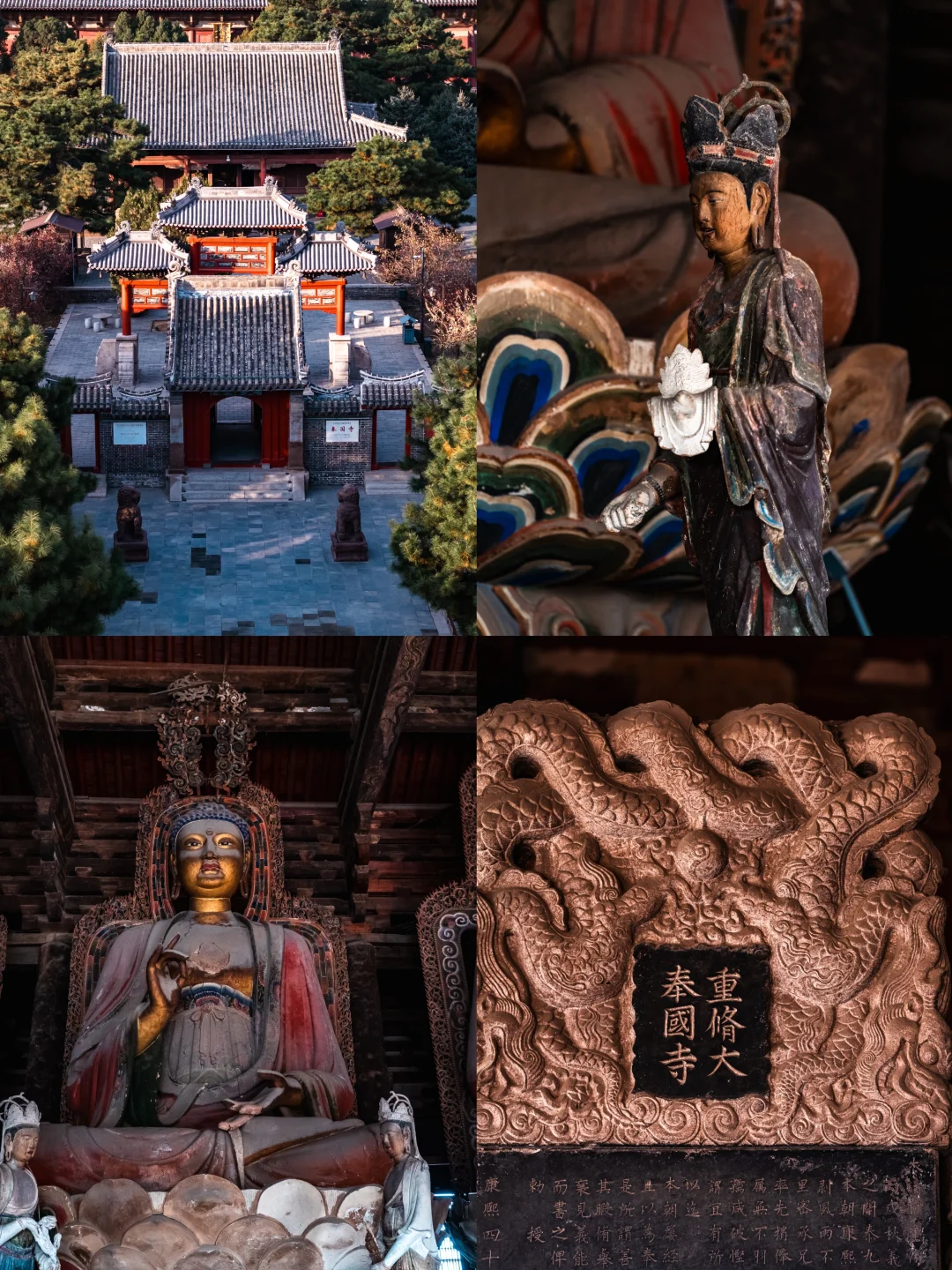✅️奉国寺:辽代建筑的天花板!大雄殿、七佛塑像、辽代彩画并称“三绝”,9米高的彩塑大佛庄重又神圣。阳光透过窗棂洒进来,尘埃浮动,连呼吸都变慢,拍照自带电影感~