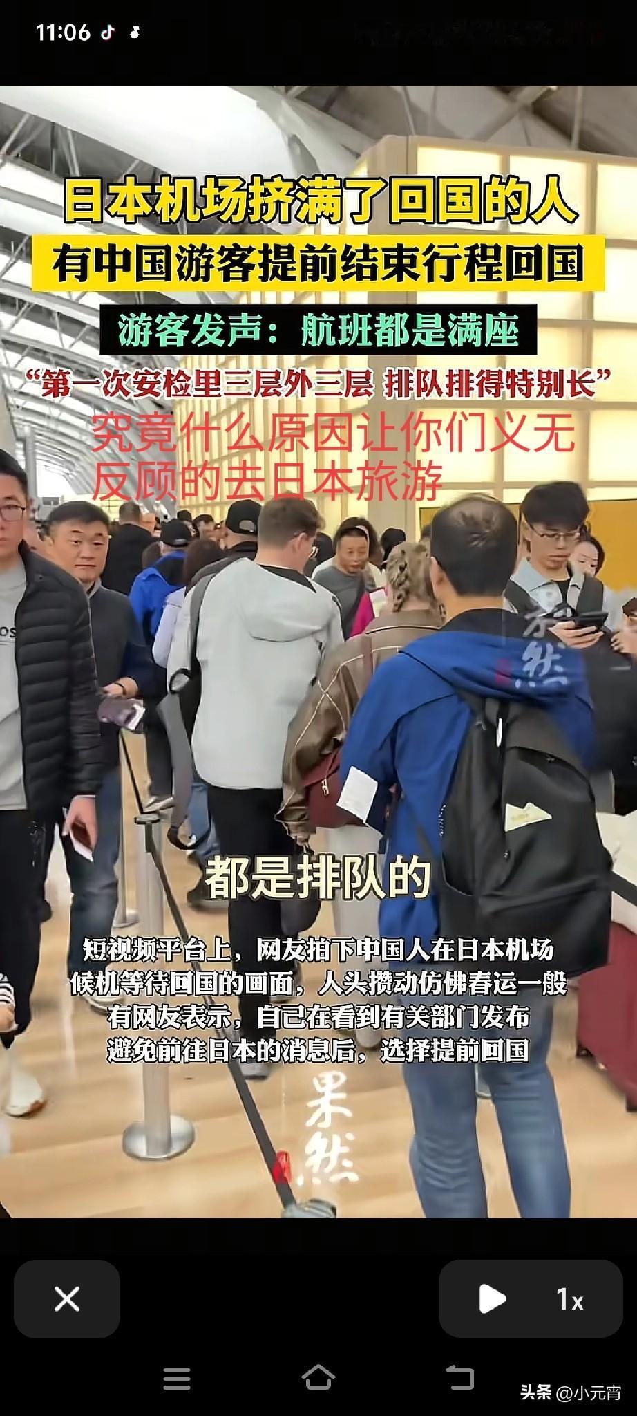 要知道,这并非节假日的高峰期间,也并非春运的浪潮。而就在不久前,国家还曾发布过明确提醒……究竟是什么原因,让这些人不顾一切,执意奔赴日本?这场突如其来的“人潮”背后,又藏着怎样的隐情? 到底咋回事?导火索是日本政客涉台言论惹众怒,加上外交部突然发安全提醒,说日本针对中国人的盗窃案猛增,连成田机场安检员都偷游客现金!这下好了,原本计划玩够再走的游客慌了,留学生们也坐不住了,纷纷改签机票往家跑。 现场那叫一个魔幻!机票价格跟坐火箭似的,东京-上海经济舱从3000元飙到近万元,还有人咬牙买商务舱。有人抱着孩子蹲角落刷购票软件,手指头都快戳烂屏幕;有留学生举着“求拼机位”的纸板到处问,眼圈红红的。航司都忙疯了,东航、南航等8家紧急宣布免费改签,使馆热线也被打爆。 这波回国潮对日本旅游业打击太大了!京都那些和服店、药妆店,以前都是靠中国游客撑场面,现在门可罗雀。有专家预测,日本旅游业要损失上万亿日元,GDP都得受影响。 说到底,这事儿不光是安全问题,更是国家情怀问题。当国家发出预警,当家人反复催促,谁不想赶紧回到踏实的地方?就像网友说的:“海外再好,都不如祖国安心。”这场回国潮,是普通人在特殊时刻最真实的选择。 你怎么看这事件?要是你在日本,会立刻买票回国吗?评论区聊聊!