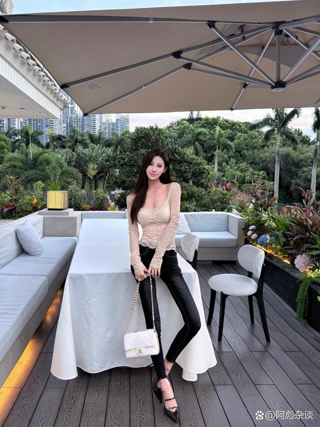 她上身穿了件浅米色蕾丝长袖上衣,蕾丝材质精致又带着柔美感,长袖设计增添了几分温婉,低领和露背的细节,又透出小性感,很好地展现出肩颈与背部线条。下搭黑色紧身牛仔裤,紧紧贴合腿部,把修长笔直的腿型完美勾勒出来。脚上是一双深色尖头高跟鞋,增加了优雅气质,还拉长了腿部比例。再搭配白色链条包,整体穿搭优雅又时尚,将身材优势尽显,十分吸睛。