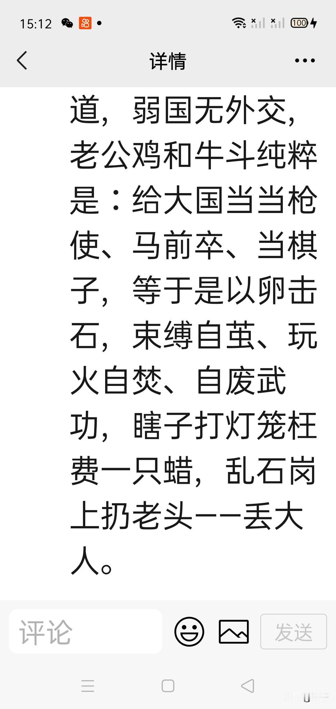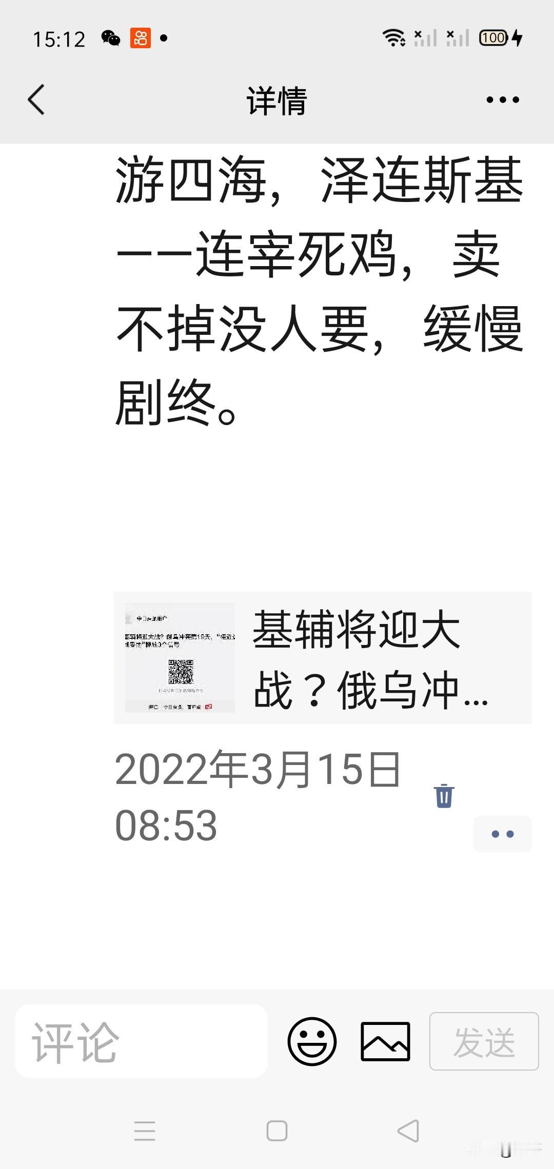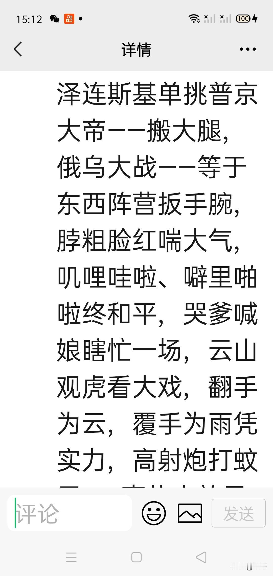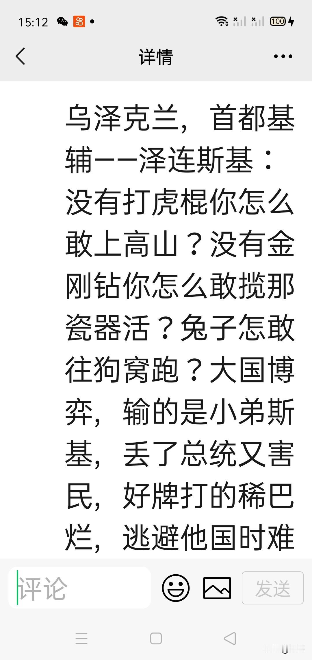 关于俄乌冲突系列之(十) 这篇文章写于2022年3月15日。 大国有威严,小国有尊严,乱作为祸害世界、丧尽天良,和为贵安定世人、国泰民祥。 保持中立,不拉帮不结盟,软不欺硬不碰是小国生存之道,弱国无外交,老公鸡和牛斗纯粹是:给大国当枪使、马前卒、当棋子,等于是以卵击石,束缚自茧、玩火自焚、自废武功,瞎子打灯笼枉费一只蜡,乱石岗上扔老头——丢大人。 乌泽克兰,首都基辅——泽连斯基:没有打虎棍你怎么敢上高山?没有金刚钻你怎么敢揽那瓷器活?兔子怎敢往狗窝了跑?大国博弈,输的是小弟斯基,必将丢了总统又害民,好牌打的稀巴烂,逃避他国时难还。 泽连斯基单挑普京大帝——搬大腿,俄乌大战——等于东西阵营扳手腕,脖粗脸红喘大气,叽哩哇啦、噼里啪啦终和平,哭爹喊娘瞎忙一场,云山观虎看大戏,翻手为云,覆手为雨凭实力,高射炮打蚊子——声势大效果小,棺材露蛋——哭的哭笑的笑,南柯一梦、虚惊一场,天快亮了,首都基辅,喜剧演员——泽连斯基——云游四海,泽连斯基——连宰死鸡,卖不掉没人要,缓慢剧终。