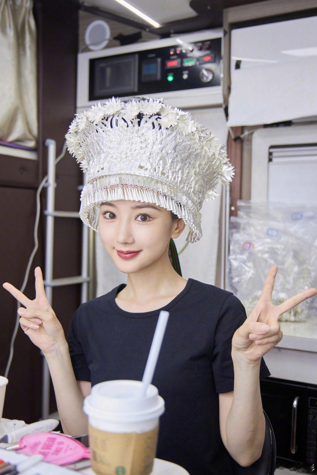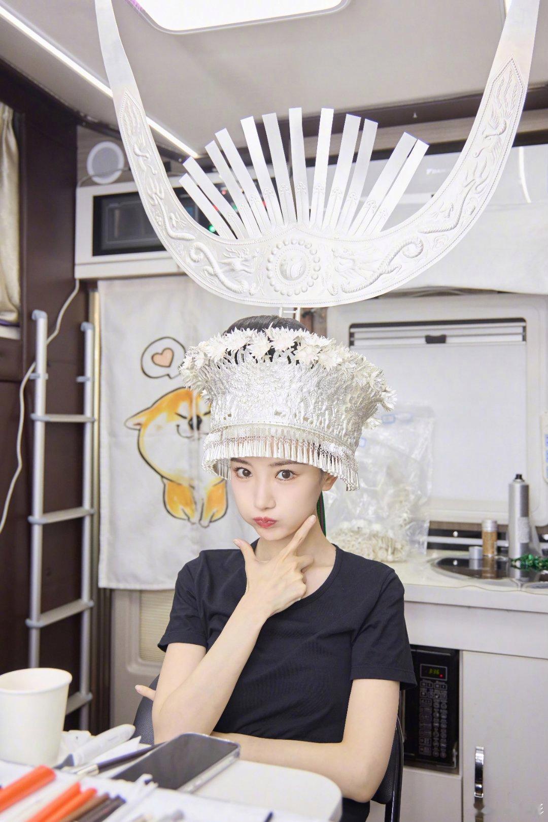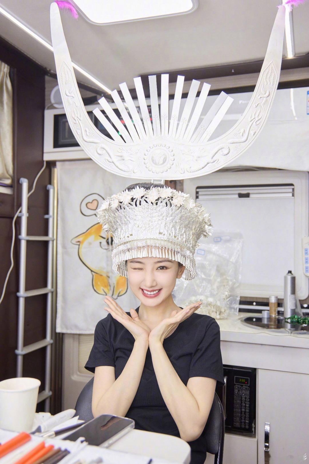 毛晓彤头戴苗族银饰头饰的路透也太惊艳了✨ 银冠上的花纹精致到发光,搭配她甜美的表情,又灵又娇~ 私下比耶、wink的小动作也超可爱,这是什么甜妹下凡现场