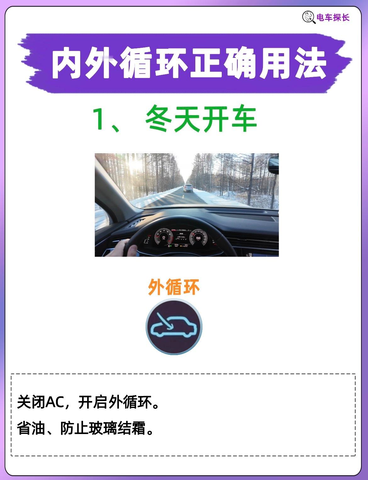 今天和朋友聊天的时候,就聊到油耗和电耗。朋友说:为啥我车油耗总是很高呢?聊完才知道原来是汽车的AC和内外循环使用不当,才导致的油耗高。借这话题,也给大家分享油车和电车AC和内外循环的正确用法。1️⃣冬天开车:关闭AC、打开外循环、前挡除雾(有雾开)作用:防止玻璃结霜/起雾。2️⃣夏天开车:操作方法:开启内循环并打开AC。作用:加速车内空气流动降温快。3️⃣雨天开车:打开外循环、打开AC、打开前挡除雾作用:防止玻璃起雾4️⃣堵车:全是尾气,先关窗,打开A/C,内循环作用:这样可能保证尾气不会进入车内5️⃣高速 打开AC、内外循环切换作用:间断的与外界空气对流6️⃣车里异味:打开外循环作用:排气快7️⃣车子暴晒:长时间暴晒后会有有害气体,先开窗通风,然后打开A/C,内循环,风量最大作用:这样能蕞大程度降温,最后关窗。