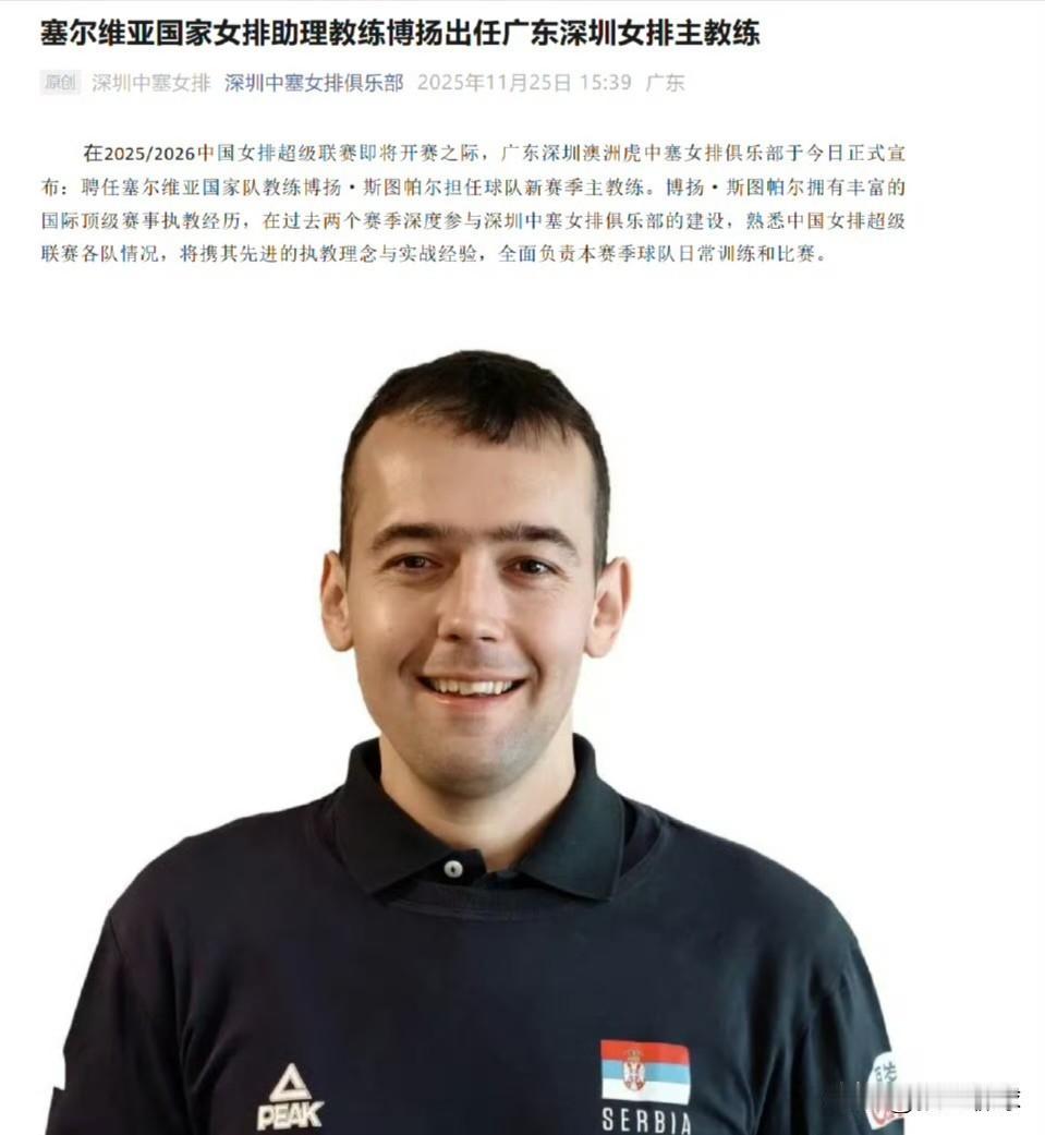 官宣:塞尔维亚国家女排助理教练博扬出任广东深圳女排主教练 在2025—2026中国女排超级联赛即将开赛之际,广东深圳澳洲虎中塞女排俱乐部于今日正式宣布:聘任塞尔维亚国家队教练博扬・斯图帕尔担任球队新赛季主教练。博扬・斯图帕尔拥有丰富的国际顶级赛事执教经历,在过去两个赛季深度参与深圳中塞女排俱乐部的建设,熟悉中国女排超级联赛各队情况,将携其先进的执教理念与实战经验,全面负责本赛季球队日常训练和比赛。