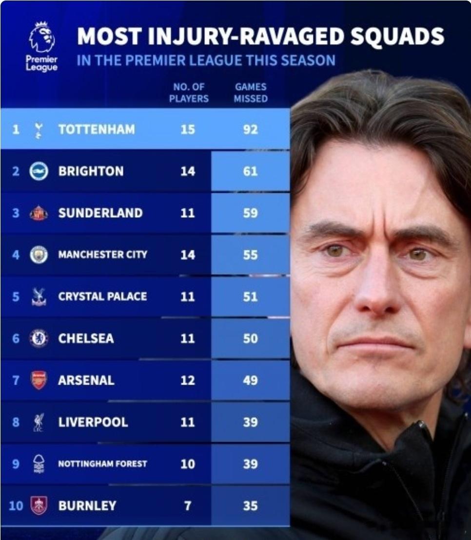 德转本赛季英超伤病榜最新一览(伤员+缺席场次完整版)德国转会市场网站盘点了2025-2026赛季英超球队伤病排行榜单,热刺以15人最多伤员排名第1,布莱顿14人位居第二,桑德兰11人排名第三位。2025-2026赛季英超联赛球队伤病榜单前10球队显示,共计9队伤员达到10人以上,包括热刺、布莱顿、桑德兰、曼城、水晶宫、切尔西、阿森纳、利物浦、诺丁汉森林,这些伤员带来的场次缺席在39场至92场之间。伯恩利是伤病情况较少的球队,他们共7人遭遇伤病,合计缺席比赛35场。纵观五大联赛不乏一些缺席比赛场数较大多的球队,热刺为联赛场次缺席最多俱乐部。另外,尼斯11名伤员缺席65场排名第二,摩纳哥伤员12人缺席63场成为缺席场数第三多俱乐部。洛里昂10人缺席63场、巴萨14人缺席62场分别成为缺席场数排名第四和第五的队伍。德转列本赛季英超球队伤病榜:(统计联赛场次,人数为人次)1、热刺:15人,合计缺席92场2、布莱顿:14人,合计缺席61场3、桑德兰:11人,合计缺席59场4、曼城:14人,合计缺席55场5、水晶宫:11人,合计缺席51场6、切尔西:11人,合计缺席50场7、阿森纳:12人,合计缺席49场8、利物浦:11人,合计缺席39场9、诺丁汉森林:10人,合计缺席39场10、伯恩利:7人,合计缺席35场
