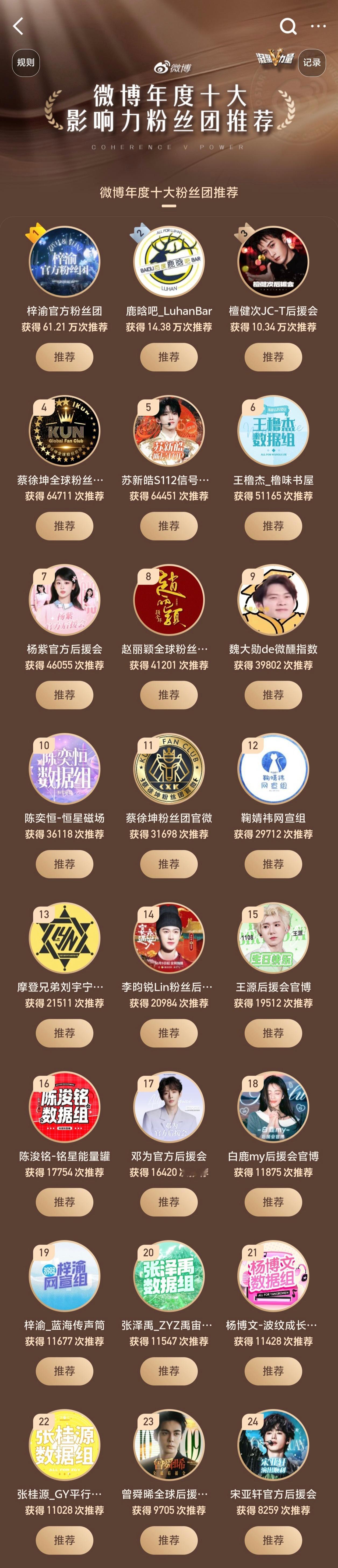 🔝截止19:50 微博年度百大粉丝联盟推荐TOP24:梓渝 鹿晗 檀健次 蔡徐坤 苏新皓 王橹杰 杨紫 赵丽颖 魏大勋 陈奕恒 蔡徐坤 鞠婧祎 刘宇宁 李昀锐 王源 陈浚铭 邓为 白鹿 梓渝 张泽禹 杨博文 张桂源 曾舜晞 宋亚轩