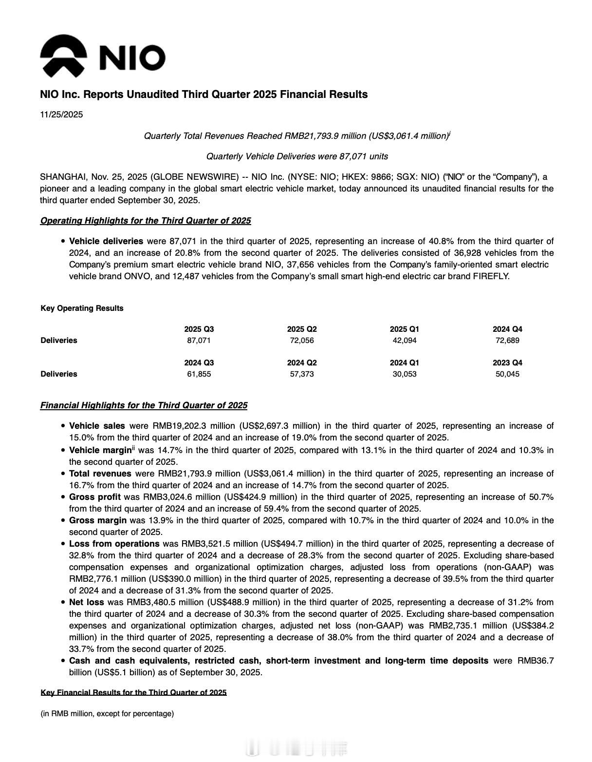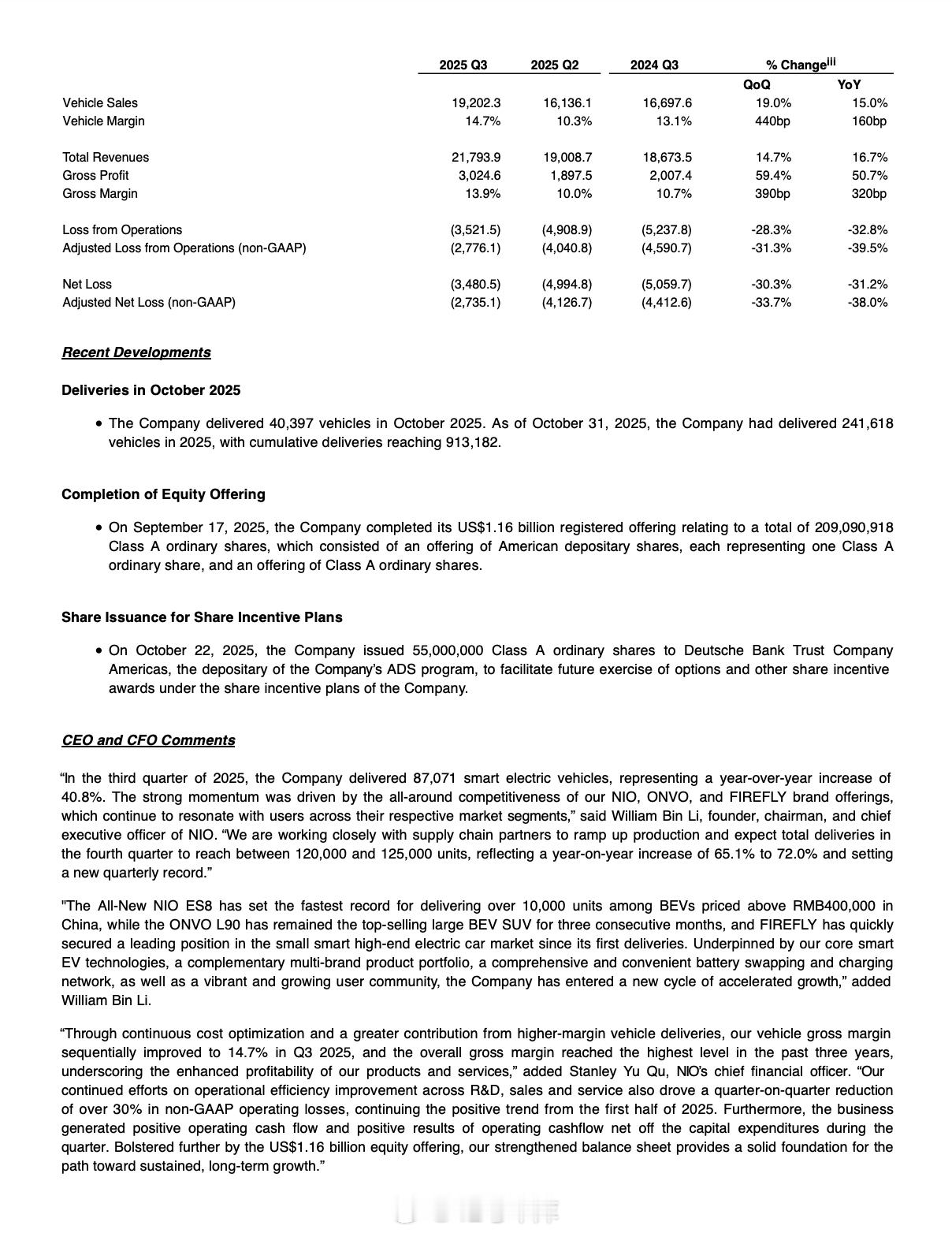蔚来 Q3 财报公布了,净亏损收窄到了 34.8 亿,非 GAAP 调整后净亏损 27.35 亿。交付量、综合毛利率、整车毛利率等都创造了历史新高。来看看核心数据:- 三季度交付 87,071 台,同比增长 40.8%,环比增长 20.8%,创历史新高;- 三季度营收 217.9 亿元,同比增长 16.7%,环比增长 14.7%,创历史新高;- 三季度综合毛利率 13.9%,创近三年来新高,产品和服务盈利能力显著增强;- 三季度整车毛利率 14.7%,创近三年新高;- 三季度现金储备 367 亿元,环比大幅增长近百亿,实现正向经营性现金流和自由现金流;- 四季度交付指引 120,000 台至 125,000 台,同比增长 65.1% 至 72.0%,创历史新高。营收指引 327.6 亿元至 340.4 亿元,同比增长 66.3% 至 72.8%,创历史新高。蔚来终于进入高歌猛进的节奏,不再每个季度都五十亿起亏了,大家觉得 Q4 蔚来能实现盈利吗?