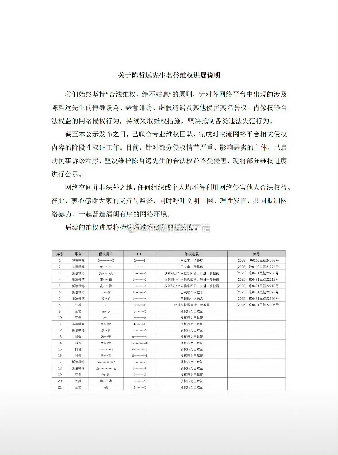 陈哲远方今天发布全平台告嘿名单了!