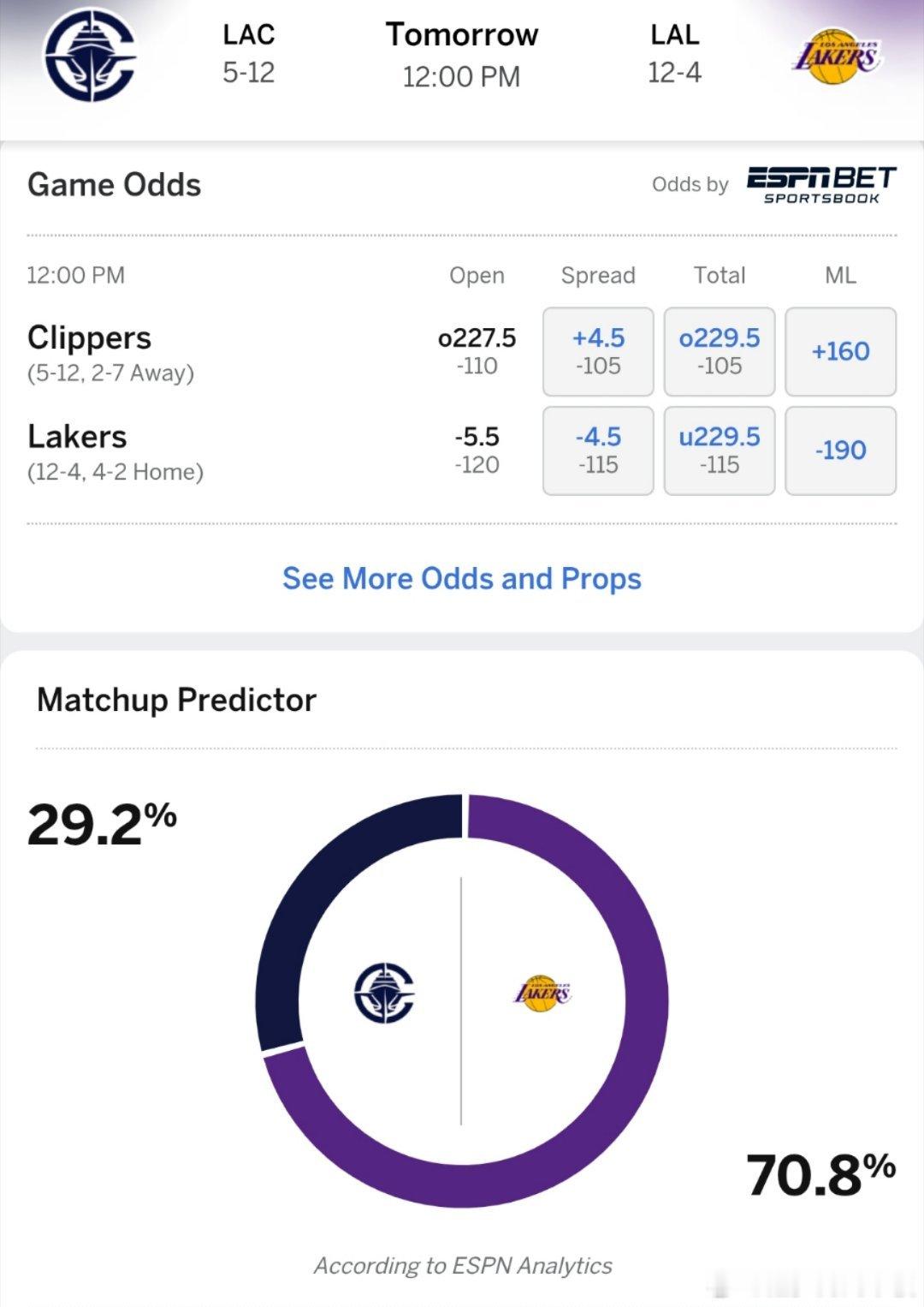 赛季首次洛城德比!ESPN预测明日快船vs湖人胜率: 快船29.2%,湖人70.8%,NBC全美直播📸上赛季两队交手4次,湖人3胜1负