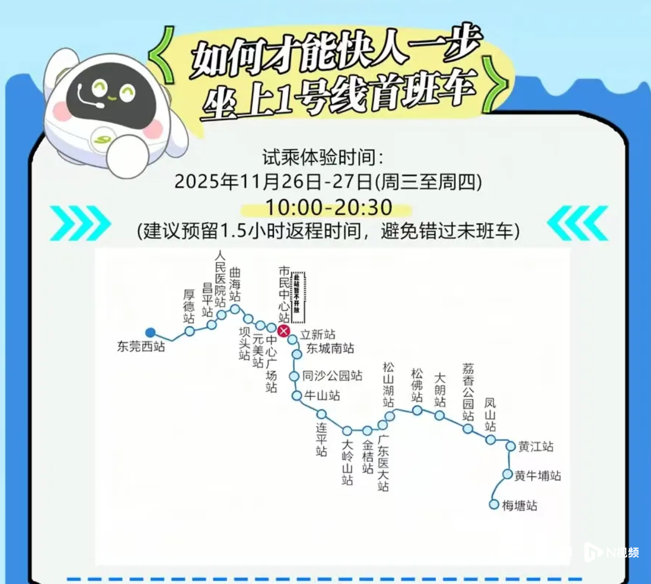 【开通在即!东莞地铁1号线票价公布,明起连续两天免费试乘】11月25日晚,东莞轨道交通更新交通线网票价图,地铁1号线沿用现行的里程分段计价票制,起步价2元,全程票价最高为11元。11月26日-27日期间,东莞地铁1号线将开展试乘活动,市民可免费进站乘车。东莞轨道交通方面表示,因地铁1号线即将开通运营,东莞轨道交通线网票价图已同步更新,实行里程分段计价票制:起步价2元,可乘坐4公里;超过4公里的,4至12公里范围内,每递增4公里增加1元;12至24公里范围内的,每递增6公里增加1元;超过24公里的,每递增8公里增加1元。市民可通过东莞轨道交通官方微信公众号查询票价图,如有疑问可拨打东莞轨道交通服务热线0769-88176666进行咨询。此外,东莞地铁1号线与已开通的地铁2号线实现了便捷换乘。根据车站内已公布的消息,通过地铁1、2号线的无缝衔接,市民从地铁网络内任一起始站出发,前往东莞火车站或虎门高铁站两大交通枢纽,单程最高票价也仅需11元,将有效降低市民跨区域通勤及远距离出行的交通成本。值得一提的是,11月26日(周三)和11月27日(周四),地铁1号线将开展为期两天的试乘活动。每天10:00-20:30,倡导市民下载“东莞地铁APP”免费进站乘车,试乘期间按照正常安检进站,请勿携带违禁用品。试乘体验期间,市民中心站将执行不停站作业(列车不停靠),市民无需前往该站乘车,可选择从中心广场站或立新站进入。据介绍,东莞1号线一期工程,途经望牛墩、洪梅、道滘、万江、南城、东城、大岭山、松山湖、大朗、黄江等镇街(园区),共设有25个站点。采写:南都N视频记者莫晓东