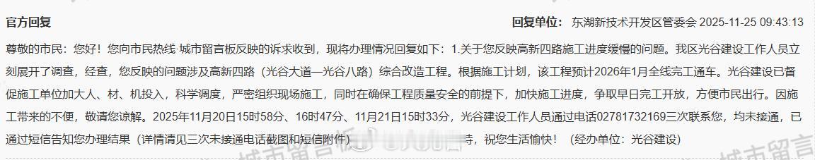 高新四路(光谷大道—光谷八路)预计2026年1月全线完工通车! 从武汉城市留言板获悉。 近日有网友咨询:高新四路与豹溪路路口完工时间。东湖新技术开发区管委会:经查,您反映的问题涉及高新四路(光谷大道—光谷八路)综合改造工程。根据施工计划,该工程预计2026年1月全线完工通车。光谷建设已督促施工单位加大人、材、机投入,科学调度,严密组织现场施工,同时在确保工程质量安全的前提下,加快施工进度,争取早日完工开放,方便市民出行。