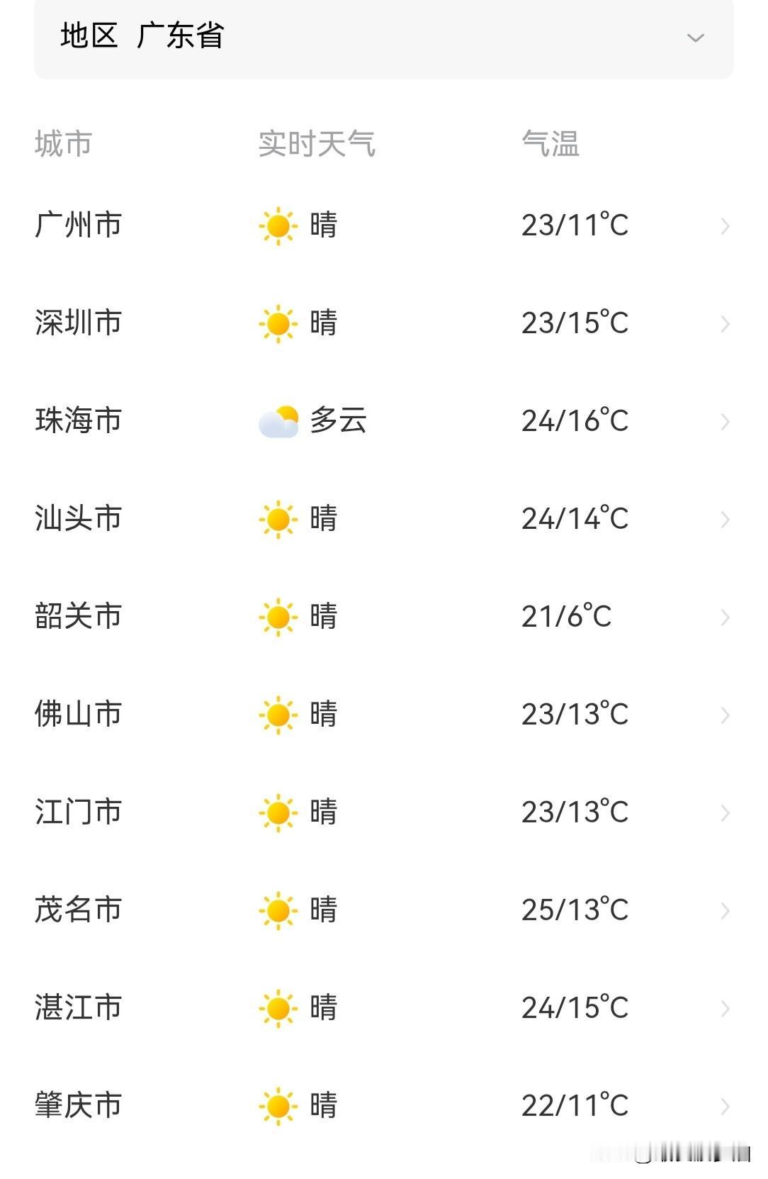 广东本周第一波冷空气已到货! 在冷空气的影响下,今天(25日)广东全省最高温仍有25℃,最低气温仅剩6℃。 27日冷空气再次补充,气温有波动。 小伙伴们需要记得添衣保暖,别着凉了! 冷空气频繁来袭,气温下降,不过依然保持晴朗干燥天气模式! 网友戏称:“广东人被风干啦”! 今天(25日),潮州喜提一个晴天,气温10~24℃,此刻气温14℃,体感温度12℃。在室内一件长袖即可,在室外吹着风,感觉有点冷,需要加件外套。 明天气温还会继续下降,不过降温幅度不大。白天依然20℃+,早晚会冷一点。周四(27日)最低气温仅剩8℃。昼夜温差相差十几度,也是醉了! 早出晚归的小伙伴们!外套记得要带上!早晚是真的冷! 近期流感病毒肆虐,除了需要根据气温变化适时增减衣物以外,还需要做好个人防护,千万别让感冒病毒有机可乘!