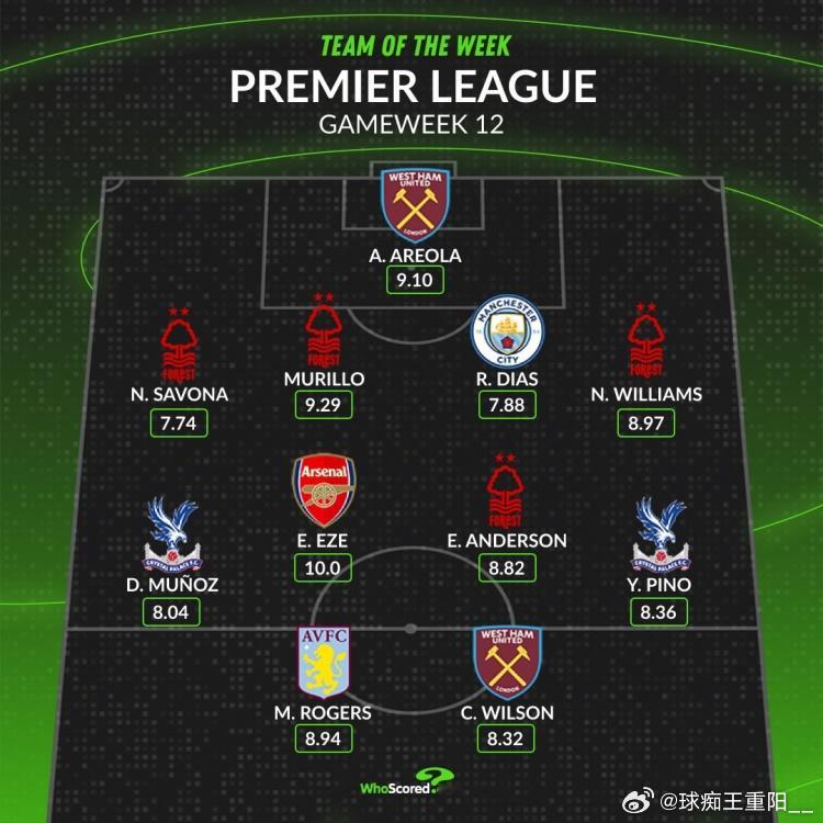 WhoScored英超第12轮最佳阵容门将:阿雷奥拉(西汉姆)后卫:萨沃纳(诺丁汉森林)、穆里略(诺丁汉森林)、鲁本·迪亚斯(曼城)、内科·威廉姆斯(诺丁汉森林)中场:穆尼奥斯(水晶宫)、埃泽(阿森纳)、埃利奥特·安德森(诺丁汉森林)、皮诺(水晶宫)前锋:罗杰斯(维拉)、威尔逊(西汉姆)