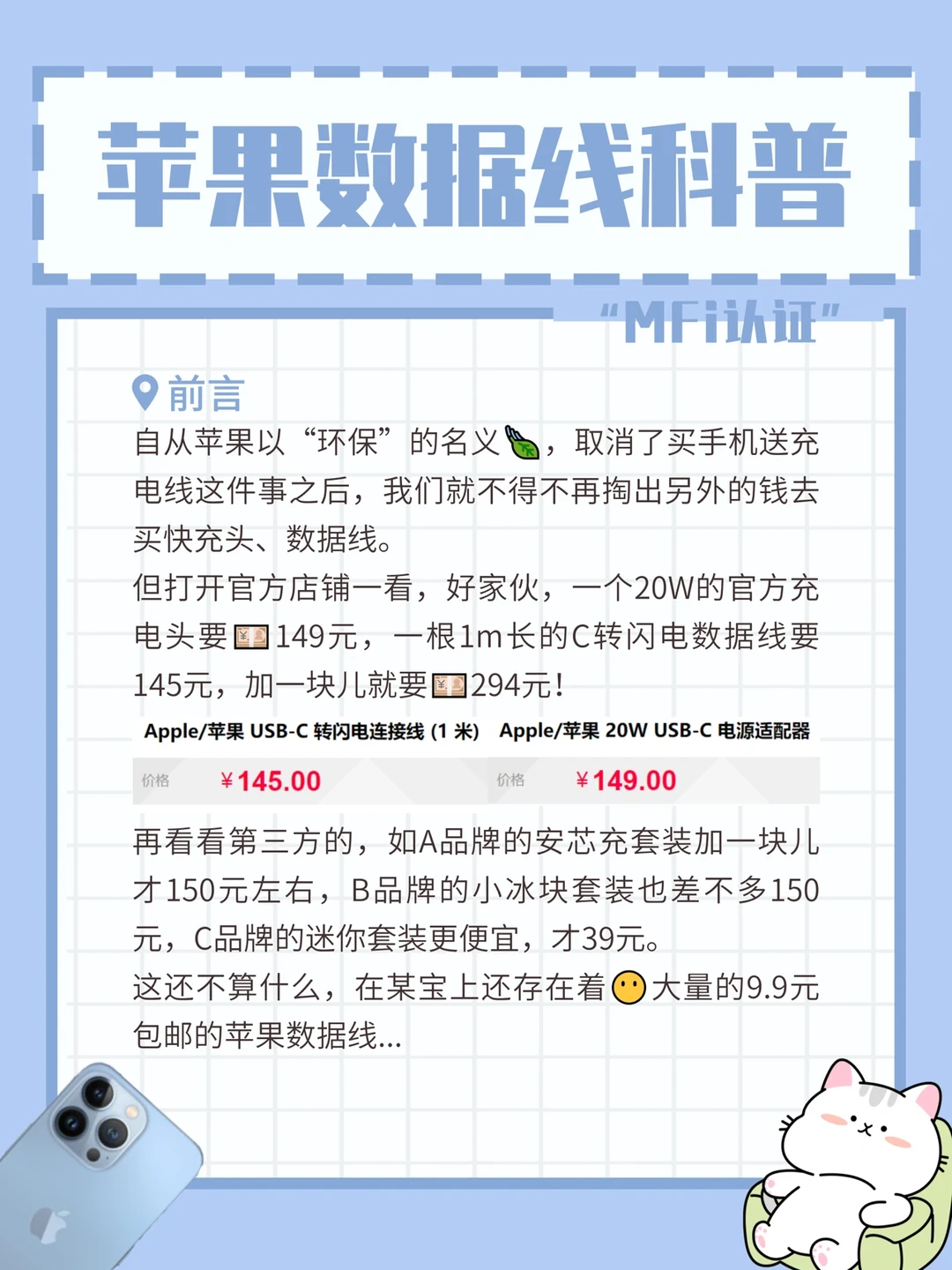 自从苹果🍎以“环保”的名义,取消了买手机送充电线这件事之后,我们就不得不再掏出另外的钱去买快充头、数据线。 但打开官方店铺一看,好家伙,一个20W的官方充电头要149元💰,一根1m长的C转闪电