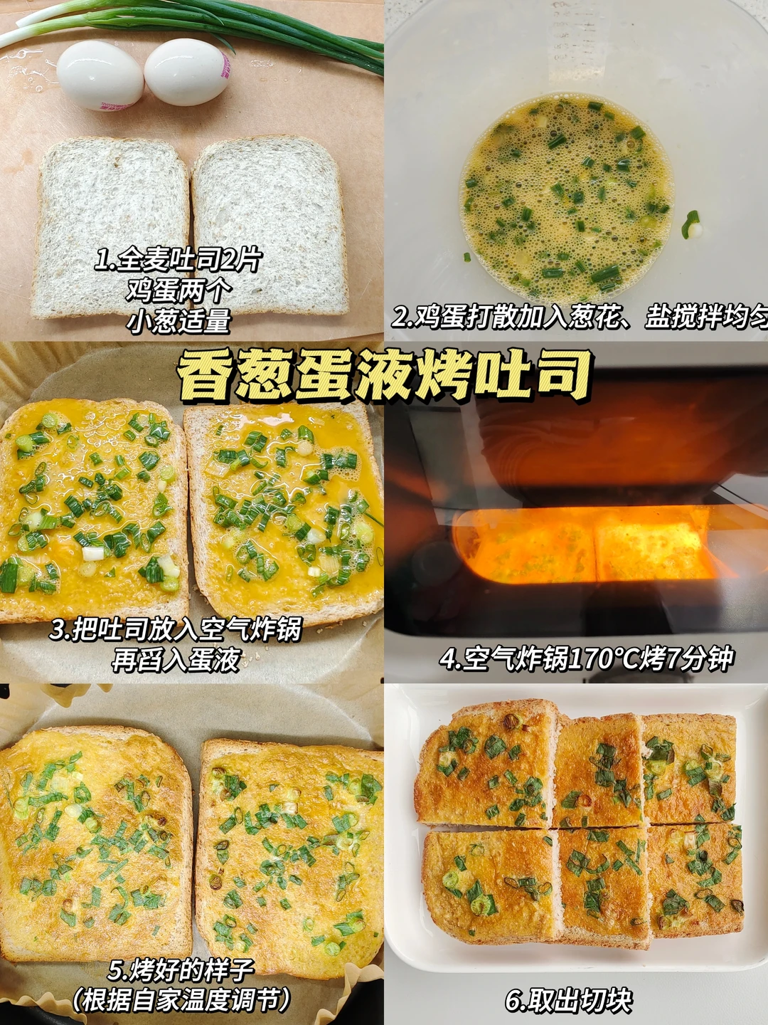 🍞 香葱蛋液烤吐司 这是我们家吃过很多次的早餐。做法非常简单,可以解决全麦吐司太干太噎,孩子不接受的问题。 . 做法见图4️⃣ . 材料: 全麦吐司2片 鸡蛋2个 小葱适量 盐适量 . 2个鸡蛋配两张吐司会有点剩余,可以留下来炒蔬菜,别浪费了~ . 炸锅版:170℃烤7分钟 烤箱版:上下火170℃烤10分钟 真的很快手,烤出来很香,一定要试试。 🍞