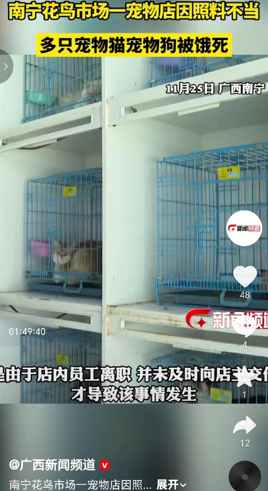 2025年11月25日,广西南宁花鸟市场的“肉嘟嘟萌宠”宠物店因照料不当员工内员工离职未及时交接,导致多只宠物猫和宠物狗因照料不当被饿死。引起发许多爱心人士关注,事后店主魏先生已诚挚道歉,店内已全面清洁消杀,店主目前亲自早晚收拾卫生、喂养宠物,后续也将招聘新员工并督促其做好宠物照料工作。(来源于@广西新闻频道 )
