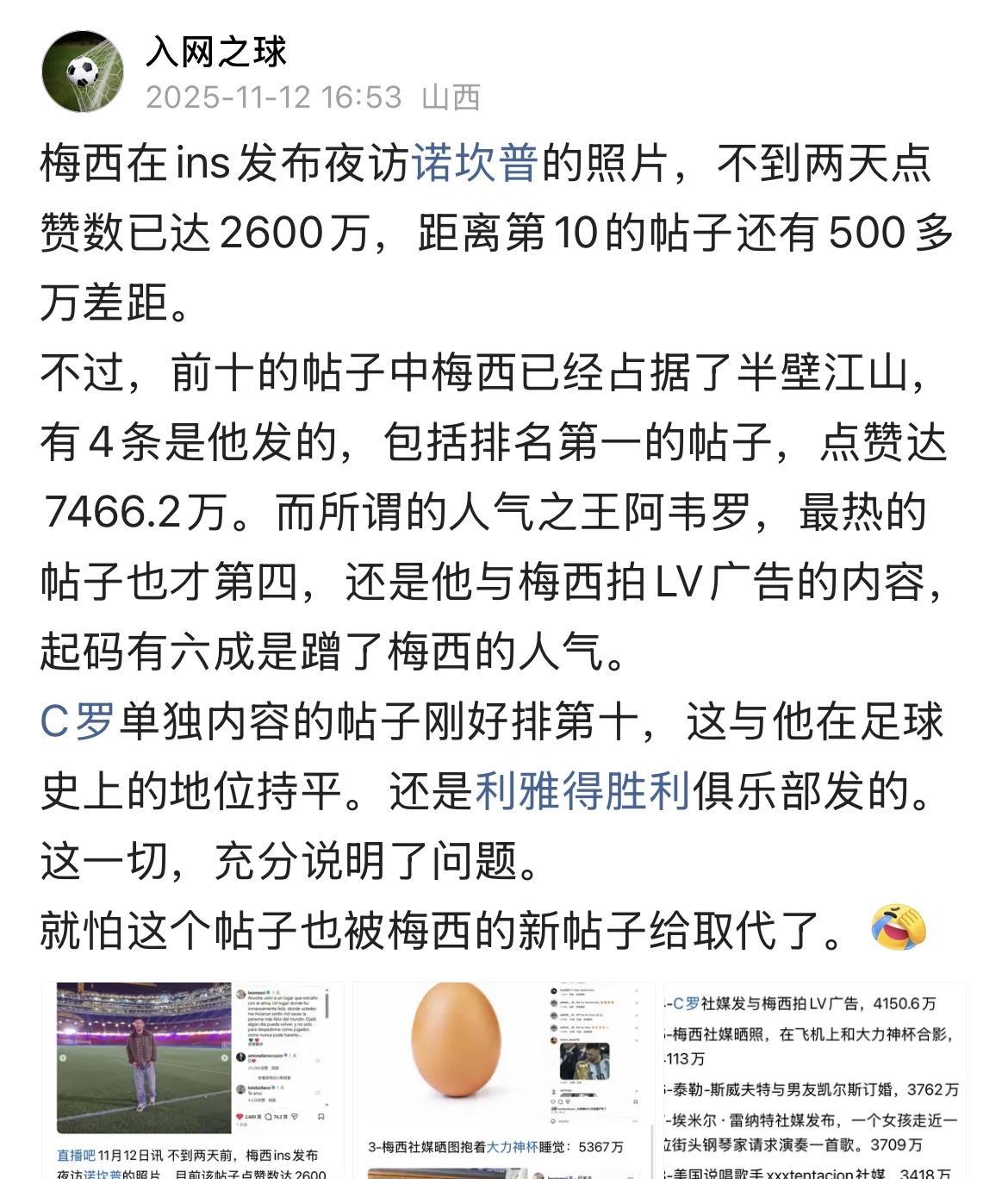 11月10日,梅西发布夜访诺坎普的帖子,目前点赞数达到3325万,超越C罗加盟利雅得胜利的帖子,排到ins历史点赞第十。 这样的话,前十的帖子,梅西个人的独占半壁江山,包括排第一的。C罗的帖子最高排第四,但内容却是他和梅西下棋,热度至少七成来自梅西。他个人的只排在第十。