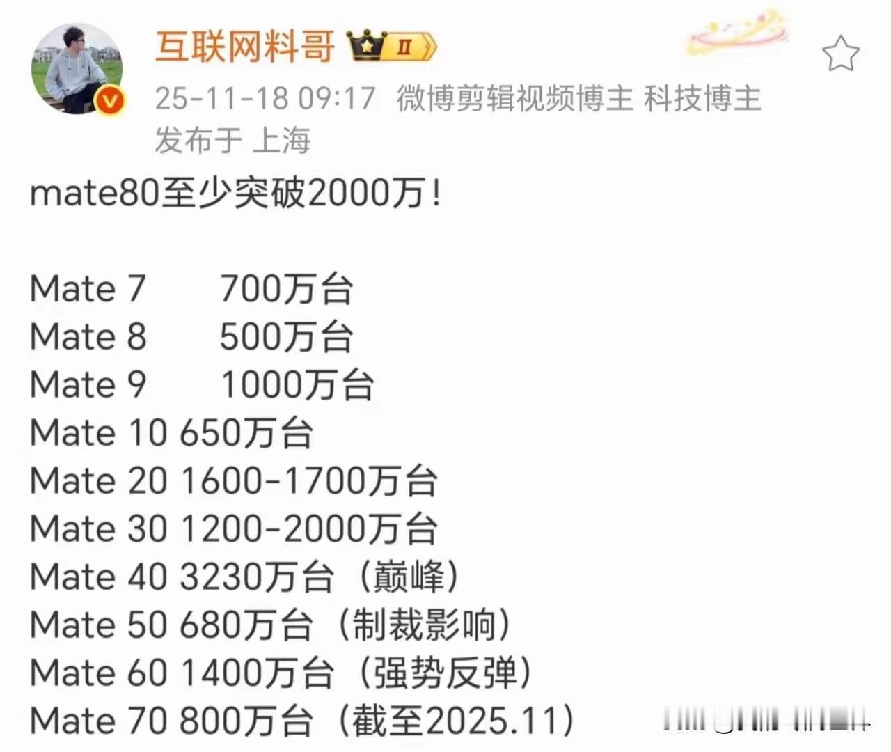 仅隔一年时间,华为mete80系列星环设计又回来了,为什么又重新回到原来的摄像模组外观,我认为跟销量还有一定关系,华为mate40和mate60都是星环设计,总销量分别是3230万台和1400万台,而mate50和mate70都是大圆环设计,销量分别只有680万台和900万台,这说明消费者对星环的外观还是非常认可,为了阻止销量进一步下滑,再次用回曾经的星环设计。