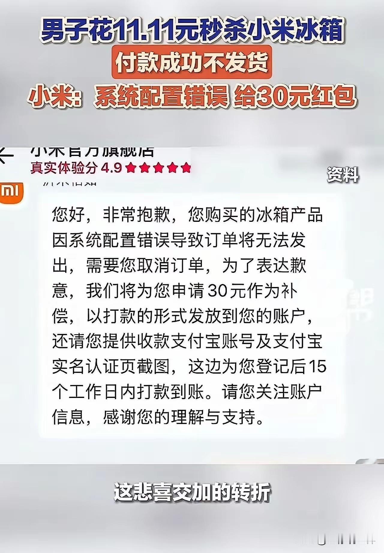 玩不起就别玩! 男子11.11 元秒杀抢得小米冰箱一台,可是付款成功后商家拒不发货。 店家说系统配置错误,价格搞错了。要求男子取消订单,作为补偿给予 30 元红包! 男子很不爽。“我秒到的是一台冰箱,不是30块钱!你们活动页面写的是’秒杀成功即发货’,现在却说价格设置错误?” “支付成功后才说错误,这不是欺诈消费者吗?” 怎么能出尔反尔?作为商家,信誉是生命。“言必信行必果”,做出的承诺再怎么艰难也得遵从!小米促销 小米零嵌冰箱 小米冰箱爆炸 二手小米冰箱 小米制冰冰箱 小米让利 小米有品冷空调