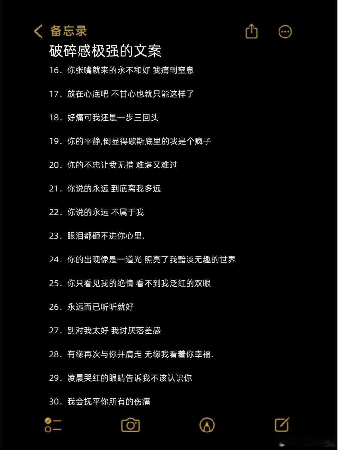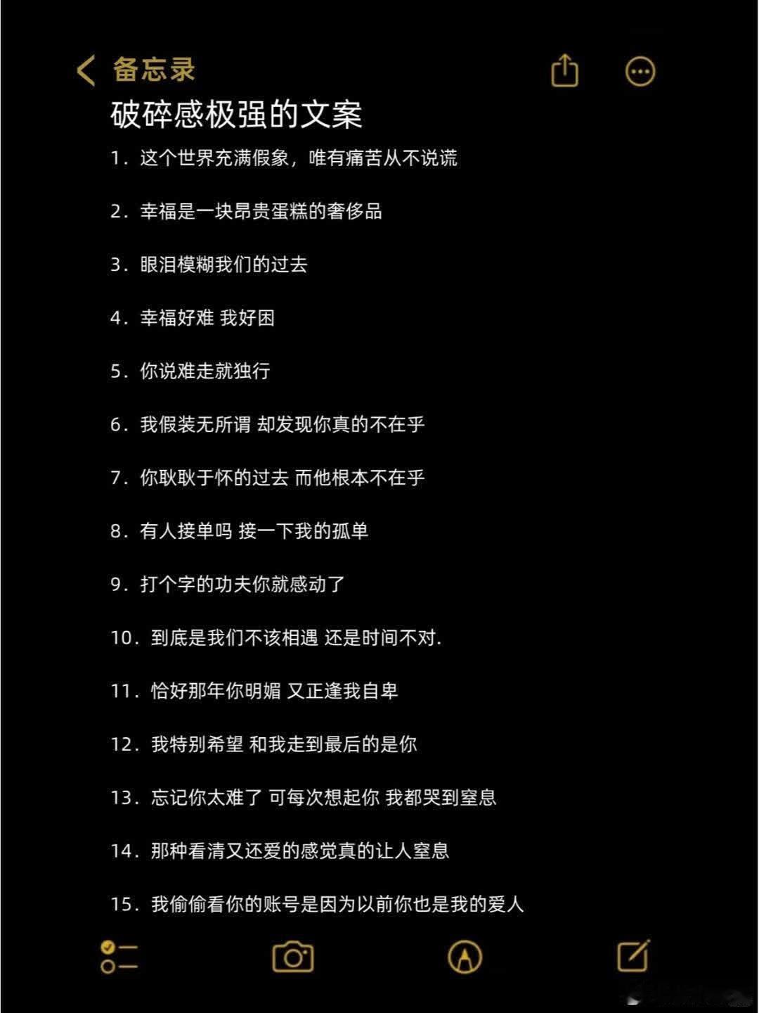 破碎感极强的文案 1.这个世界充满假象,唯有痛苦从不说谎 2.幸福是一块昂贵蛋糕的奢侈品 3.眼泪模糊我们的过去 4.幸福好难 我好困 5.你说难走就独行 6.我假装无所谓 却发现你真的不在乎 7.你耿耿于怀的过去 而他根本不在乎 8.有人接单吗 接一下我的孤单 9.打个字的功夫你就感动了 10.到底是我们不该相遇 还是时间不对. 11.恰好那年你明媚 又正逢我自卑 12.我特别希望 和我走到最后的是你 13.忘记你太难了 可每次想起你 我都哭到窒息 14.那种看清又还爱的感觉真的让人窒息 15.我偷偷看你的账号是因为以前你也是我的爱人 16.你张嘴就来的永不和好 我痛到窒息 17.放在心底吧 不甘心也就只能这样了 18.好痛可我还是一步三回头 19.你的平静,倒显得歇斯底里的我是个疯子 20.你的不忠让我无措 难堪又难过 21.你说的永远 到底离我多远 22.你说的永远 不属于我 23.眼泪都砸不进你心里. 24.你的出现像是一道光 照亮了我黯淡无趣的世界 25.你只看见我的绝情 看不到我泛红的双眼 26.永远而已听听就好 27.别对我太好 我讨厌落差感 28.有缘再次与你并肩走 无缘我看着你幸福. 29.凌晨哭红的眼睛告诉我不该认识你 30.我会抚平你所有的伤痛