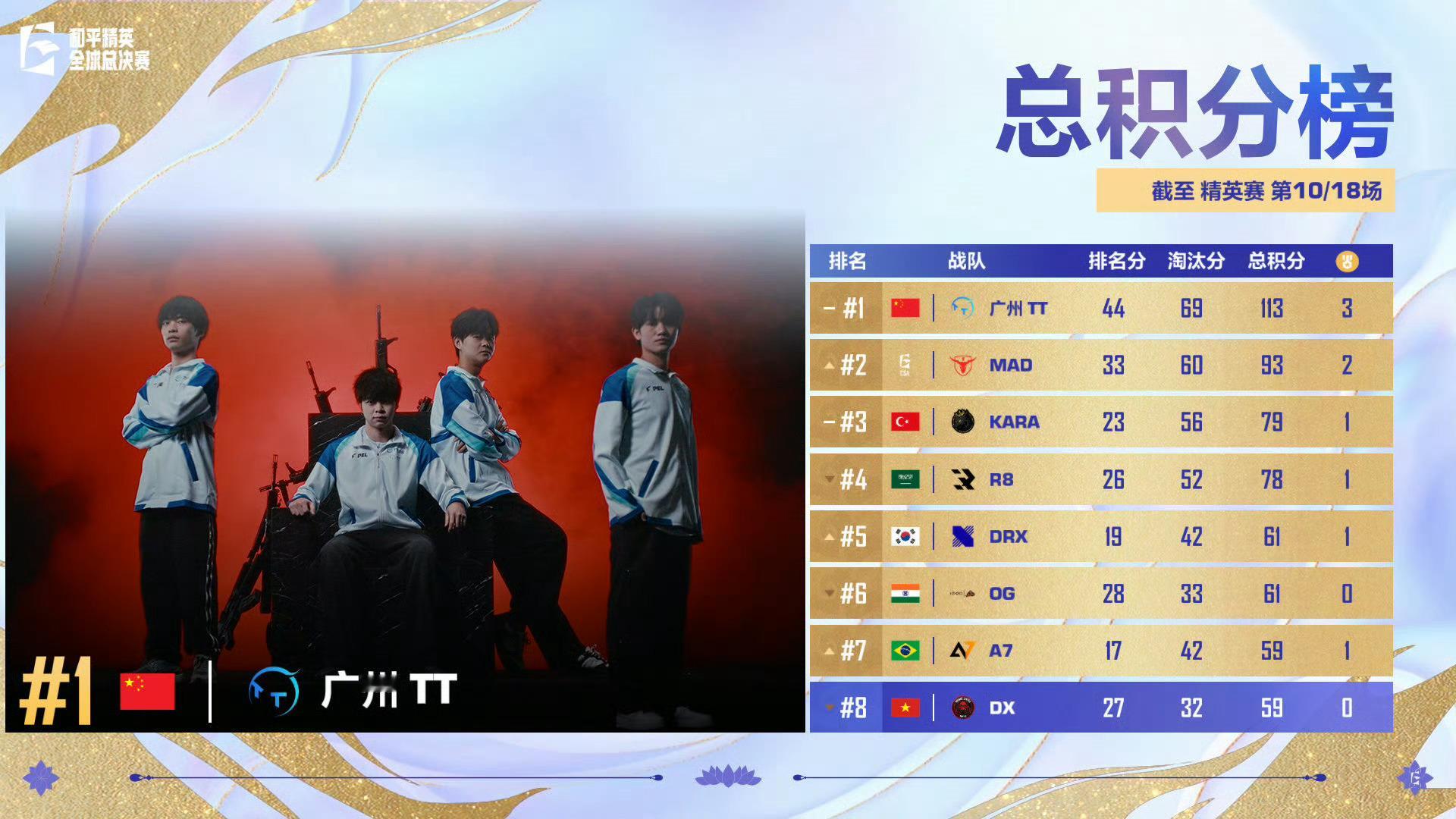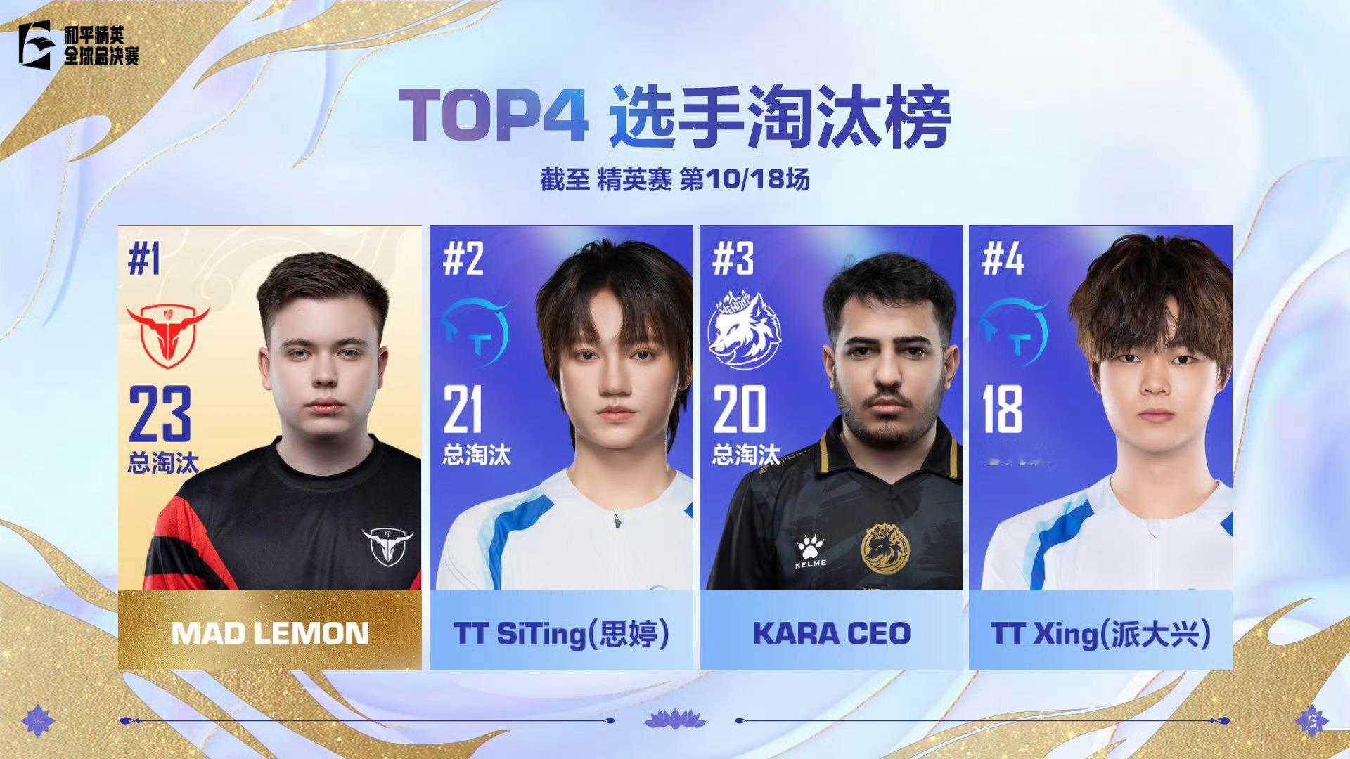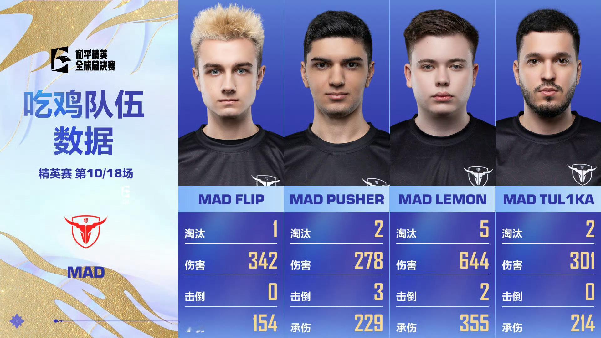 【精英赛 Day2 第四场】获胜队伍:MAD战队MVP:MAD·LEMON截至本场总积分榜第—名: 第二名:MAD战队 第三名:KARA战队 第四名:R8战队第五名:OG战队截至本场淘汰榜第—名:MAD·LEMON第二名: 第三名:KARA·CEO第四名: