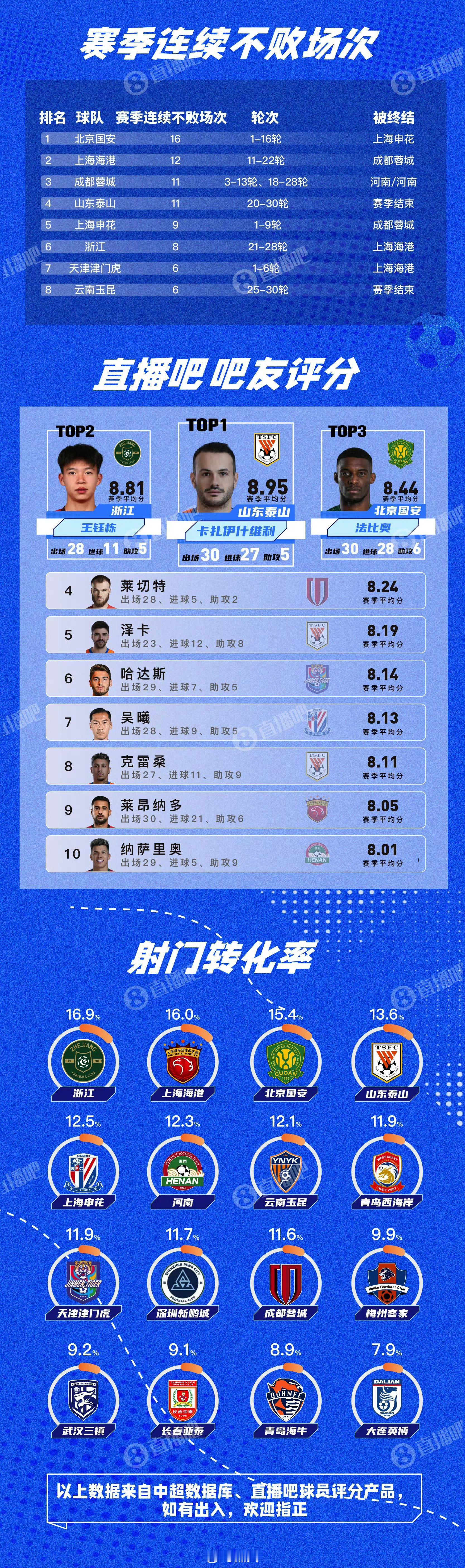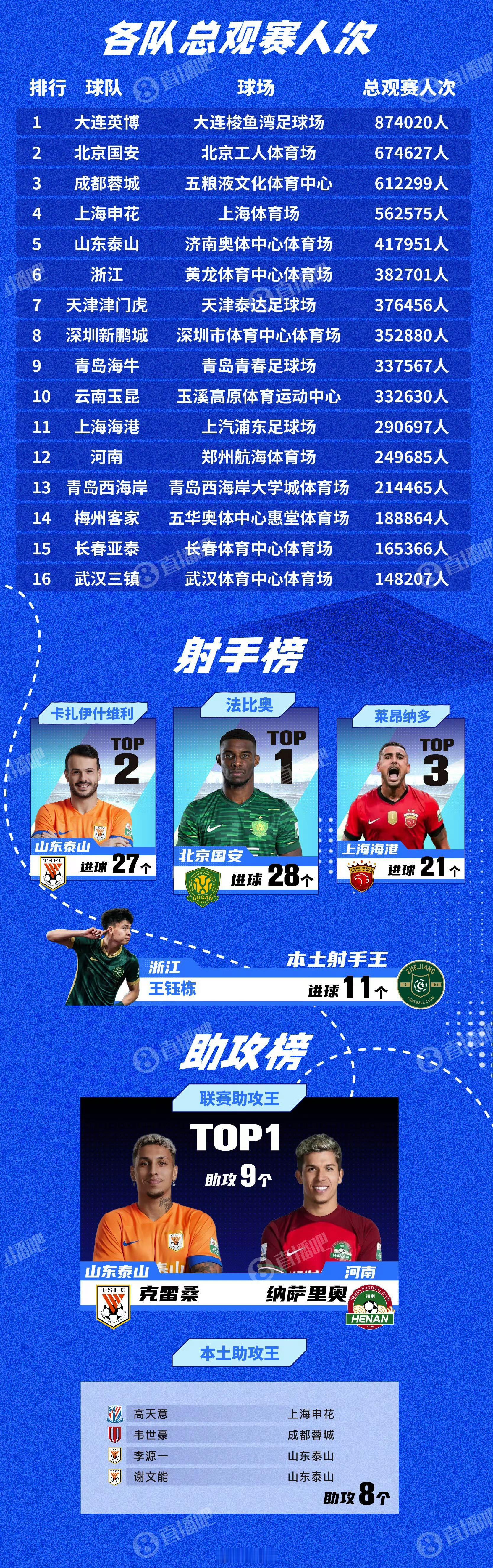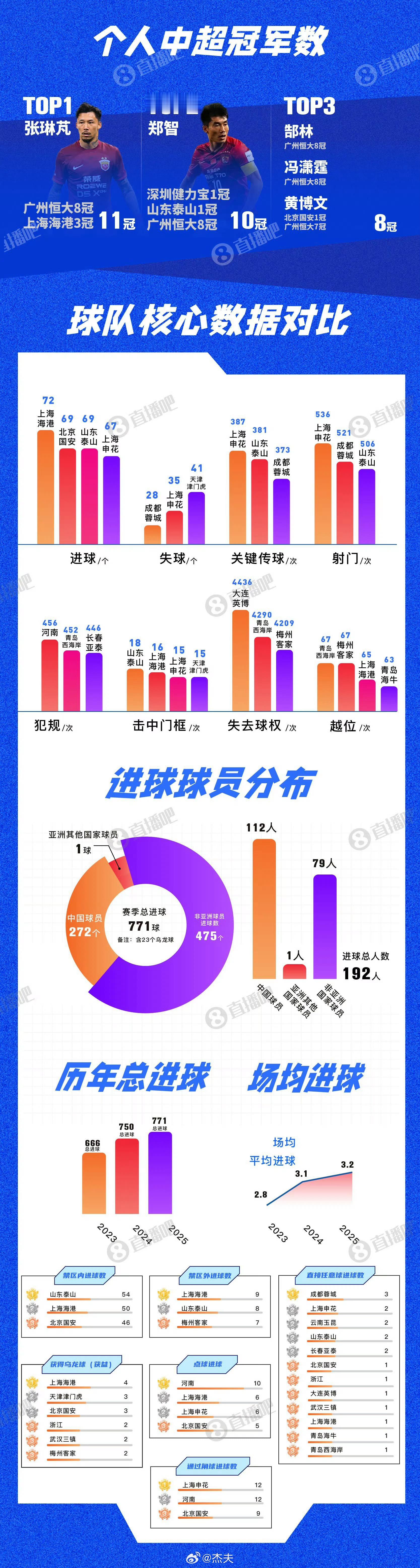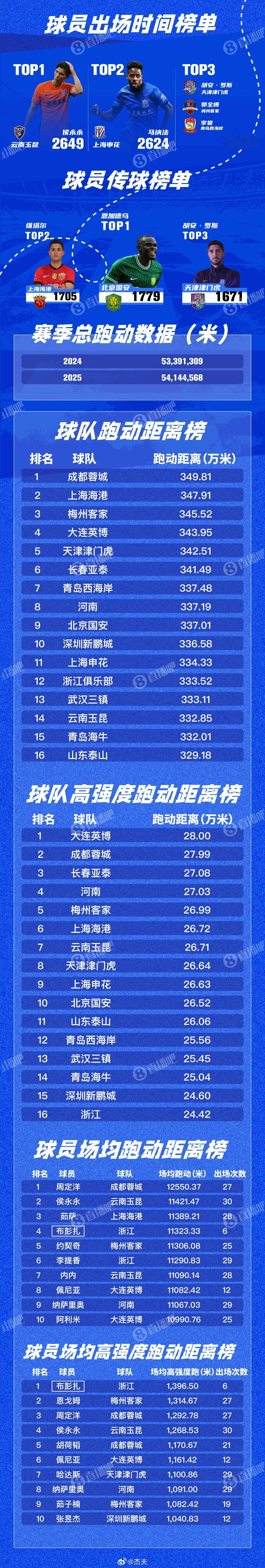 2025赛季中超落幕,张琳芃11冠成为“中超冠军王”,是资历也是中超的见证;上座率能看出中超人气高低,跑动数据反映赛场强度,最佳阵容则是赛季表现的浓缩。这些数据不仅是总结,更能让球迷看清联赛的亮点与待提升的地方,为下赛季蓄力。💪 |