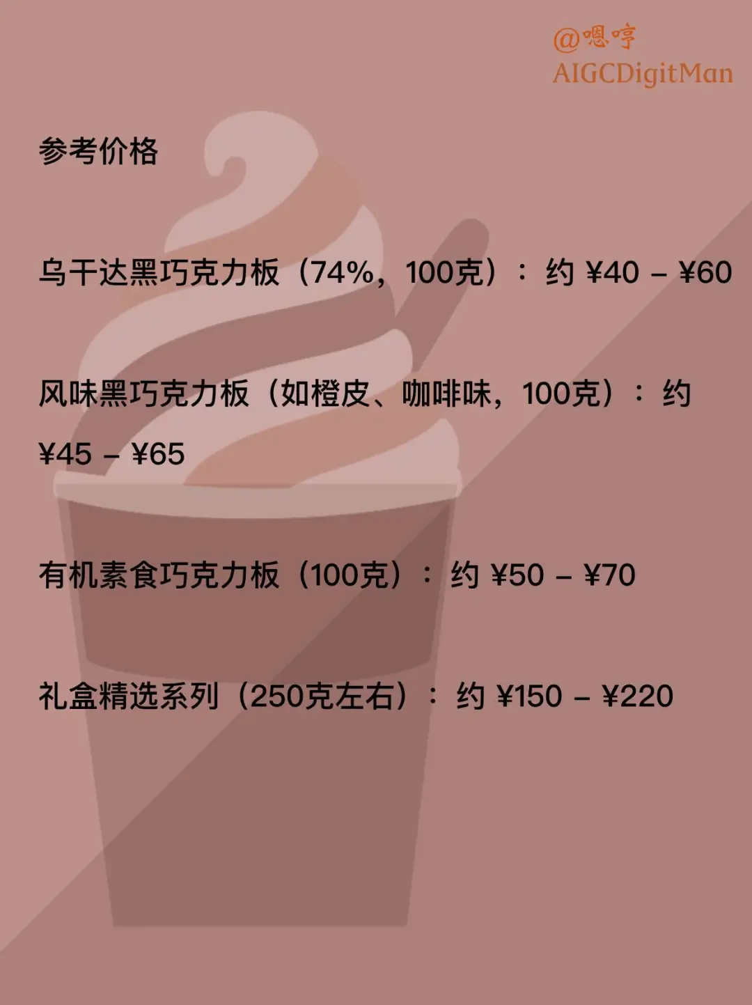 风味黑巧克力板(如橙皮、咖啡味,100克):约 ¥45 - ¥65