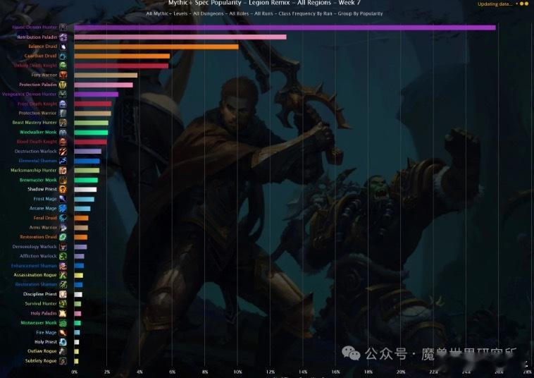 军团再临幻境新生模式:最热门专精排行浩劫恶魔猎手本周下降了1.7% 。没错,这个幻境新生模式的霸主专精本周失宠了。若放在正式服数据中,1.7% 的跌幅对任何专精来说都是 “大幅下滑”,但对幻境新生模式的浩劫来说,这仅意味着其占比仍略超四分之一,最终稳定在 25.6%。此外,惩戒骑占比也小幅下降,而邪DK则逆势上涨,与守护德在第五名位置上 “并驾齐驱”。