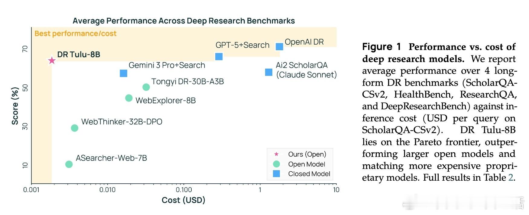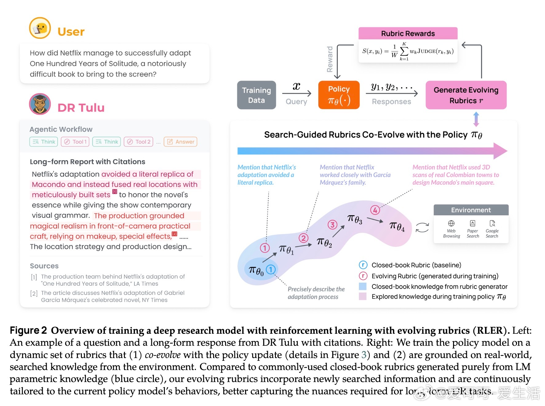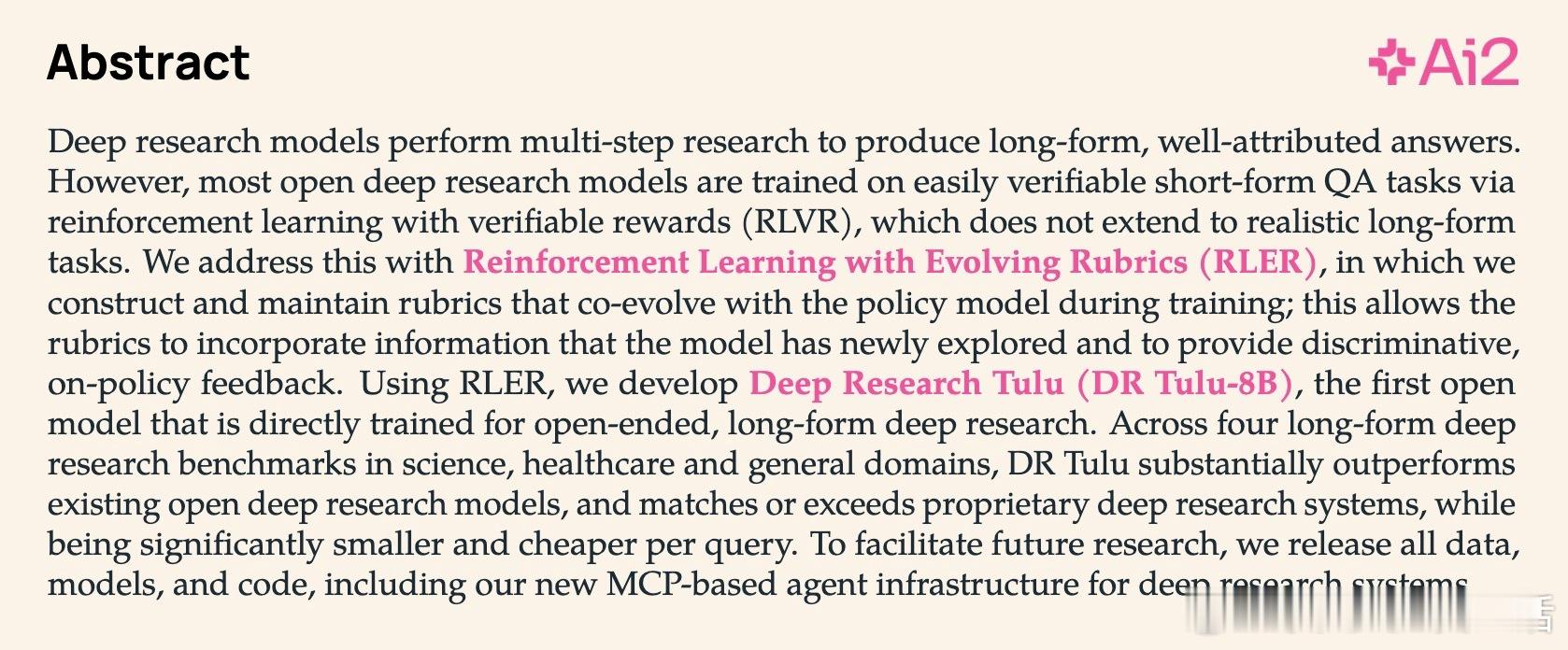 [CL]《DR Tulu: Reinforcement Learning with Evolving Rubrics for Deep Research》R Shao, A Asai, S Z Shen, H Ivison... [University of Washington & Allen Institute for AI & MIT] (2025) 本文发布了DR Tulu-8B,首个面向开放式长篇深度研究任务的开源深度研究模型。该模型采用创新的“演进评分标准强化学习”(RLER)方法训练,动态构建并更新针对模型当前行为的评估标准,结合实时检索的外部知识,解决了长文本研究任务中复杂且难以验证的评价难题。DR Tulu-8B在科学、医疗和通用领域的四个长篇深度研究基准上,显著优于所有现有开源模型,甚至匹配或超越了商业闭源系统,且模型规模更小,查询成本低近千倍。它能灵活选择多种检索工具,根据任务特性调整搜索策略,实现更高效的知识整合和引用支持。本文还发布了完整训练数据、模型权重、代码以及支持多工具异步调用的深度研究基础库(dr-agent-lib),为未来研究提供开放、可扩展的实验平台。DR Tulu已在真实医疗基因变异解读任务中展现出强大推理和证据综合能力,证明其在专业领域的广泛适用性。此次工作不仅推动了深度研究模型从短答案向复杂长文本的跨越,还首次实现了训练时评价标准与模型策略的互动演进,拓展了强化学习评价范式。未来,我们期待基于该框架探索更复杂的多模态科学工具集成及定制化领域适配,持续提升开放深度研究技术的能力与透明度。全文详见 arxiv.org/abs/2511.19399 开源地址:github.com/rlresearch/dr-tulu 模型与数据集:huggingface.co/collections/rl-research/dr-tulu 官方博客:allenai.org/blog/dr-tulu深度研究的未来属于不断进化的智能评价体系和灵活多样的知识检索,DR Tulu开创了这一新时代。