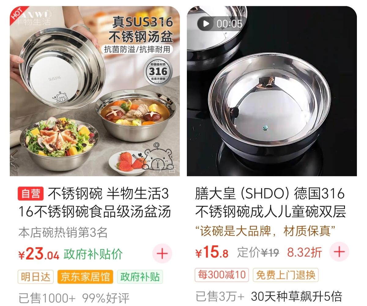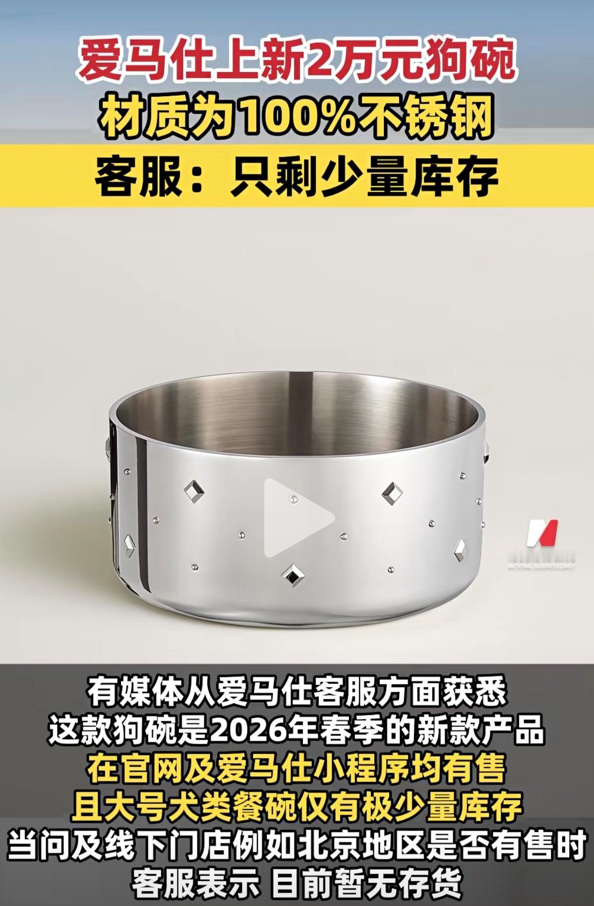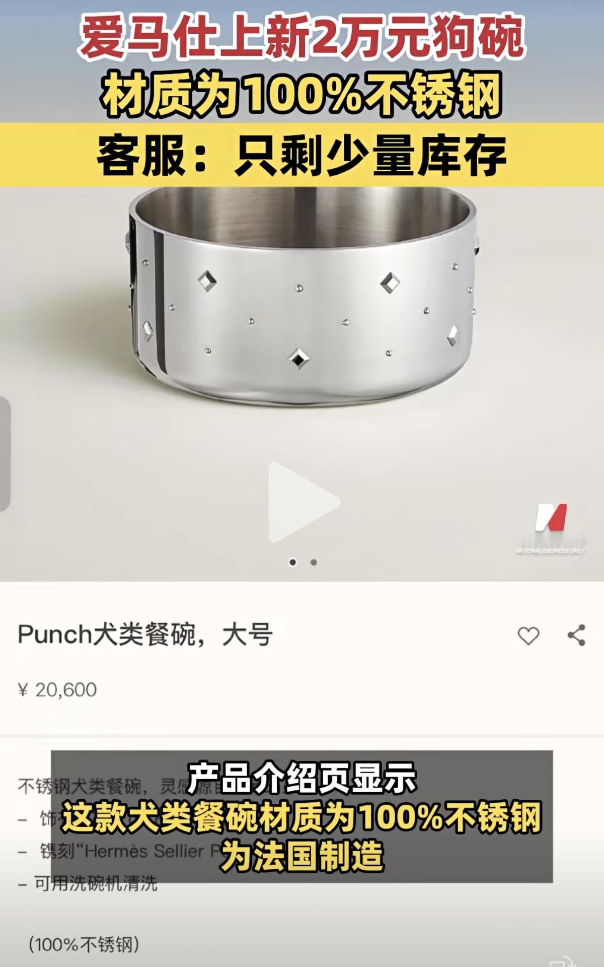 爱马仕在其官方网站上,上架了两款不锈钢碗。售价大碗为20600元,小碗为18300元。用途是犬类碗,也就是俗称的狗碗。这款碗标注为法国制造,100%不锈钢。目前仅在官网和小程序售卖,暂时没有在实体门店上架。不知道是304的,还是316的不锈钢!我看了一下京东平台上销售的316不锈钢碗,售价在15-23元左右。