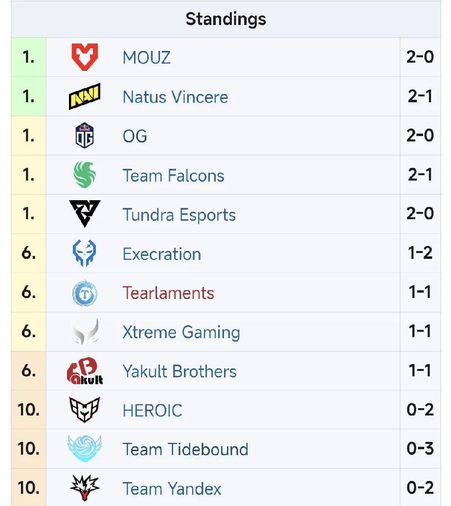 Blast成都站小组赛首日赛果,三胜六负 YB 1:0 Falcons,意外之喜,没想到也能暴打法老 XG 1:0 HEROIC,翻盘成功,崩盘的中路,哥哥和x哥带队,森哥发大力拿下。 YB 0:1 OG,只能赢一局,曾经的小弟也打不过了。 TBD 0比1 NV,打不过 XG 0:1 MOUZ,中路再次崩了,不敌新科状元 TBD 0:1 TL,内战,TBD被翻盘,两连败。 TBD 0:1 Falcons,实力不行,三连败。 TL 0比1 EC,东南亚小弟也打不过了。