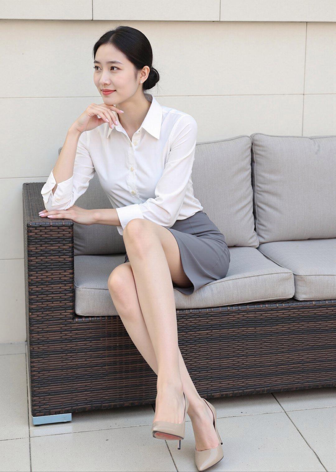 优雅白领,时尚穿搭,自信微笑,都市女性风范。