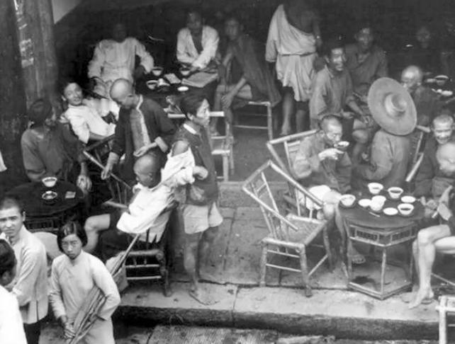 1941年龙泉驿乡场的檐下茶馆,竹制桌椅随意摆开,粗瓷盖碗在木桌上摞起半尺高,裹着短褂、剃着光头的乡民们或跷脚倚在竹椅里啜茶,或站在桌旁凑头闲聊,赤脚踩在潮湿的石板地上。 这处茶馆是当时乡场的“公共客厅”:既是乡民歇脚、议事的去处,也是赶集时临时的“信息站”,即便身处抗战乱世,四川乡野的日常烟火气,仍在这盖碗碰撞的声响里缓缓铺展。