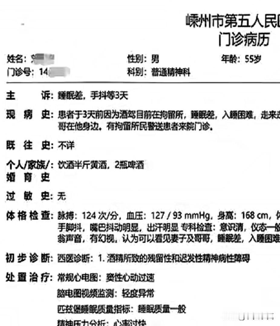 浙江光棍拘留所暴毙,尸检报告有骨折迹象,拘留通知成关键 1970年出生的刘某火,在浙江嵊州漂泊半生,未婚的他与女友相伴,嗜酒是亲友皆知的习性。谁也没想到,一场酒驾引发的连锁反应,最终夺走了他五十余岁的生命。 6月3日中午,酒过三巡的刘某火驾车上路,刚驶出不久便被交警查获酒驾。这起看似普通的交通违法,在十几天后演变成了悲剧。6月5日,他的血样被送往绍兴文理学院司法鉴定中心,6月11日鉴定结果出炉,酒精含量已达行政拘留标准。13日完成体检且显示无明显异常后,他被处以13天拘留,当晚还回到女友家中留宿,次日正式进入拘留所。 变故发生在拘留期间。同监室人员回忆,刘某火起初只是话多牢骚,到6月17日已出现明显异常:手抖、胡言乱语、彻夜难眠、口唇震颤。即便症状如此明显,拘留所医生未采取有效措施,直至当日下午才将其送往嵊州市第五人民医院精神科就诊,病历明确诊断为“酒精所致的残留性和迟发性精神病性障碍”,医生开具药物后,他仍被送回拘留所继续执行拘留。 家属查阅《拘留所条例》发现,第十九条明确规定,被拘押人患有精神病需隔离治疗的,拘留所可建议停止执行拘留。但直至6月18日凌晨刘某火在监控记录下猝然离世,家属既未收到任何病情通知,也未见到“停止执行拘留”的相关文书。医院给出的死因是“心源性猝死”,医学上这类死亡与长期饮酒、年龄因素及情绪波动密切相关,但这并未打消家属的疑虑。 更让家属崩溃的是,事后他们奔波于嵊州市中医院复印病历、尸检报告,手中资料堆积如山,却迟迟拿不到本该早已送达的拘留通知书,诸多后续程序因此受阻。无妻无子的刘某火,身后事全由侄女刘女士一人扛下,她整日对着一堆材料发呆,满心困惑无处安放。 目前嵊州市公安局回应,上级督察部门已介入调查并与家属对接。网友对此议论纷纷:有人谴责酒驾本身的危害性,也有人质疑拘留所为何未按条例及时处置病患,若早一步通知家属或停止执行拘留,悲剧是否能避免? 一场酒驾,一份明确的精神科诊断,一条被忽视的法规,一段定格生命最后时刻的监控,交织成这起令人唏嘘的事件。酒驾固然有错,但生命安全理应得到基本保障。督察部门的调查能否还原全部真相,相关程序是否存在疏漏,这些疑问都亟待一个明确答案。而这起悲剧也警示世人:酒驾需严惩,执法更需温度,生命面前,任何程序都不应打折扣。