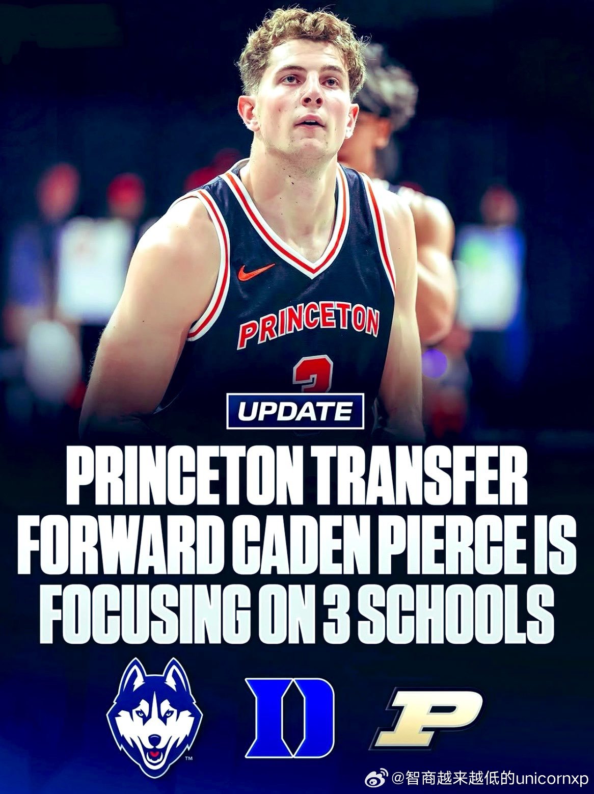 常青藤联盟没有NIL但有好文凭,普林斯顿大学前锋Caden Pierce为了两者兼得本赛季选择了红衫,能拿到普林斯顿大学毕业证书后转校去high-major大学,目前去向主要包括康大、杜克以及普渡大学