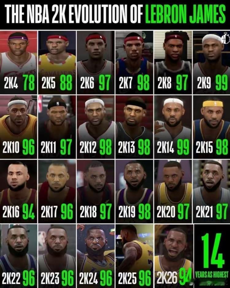 詹姆斯生涯2K值演化:新秀赛季78最低,两次99分