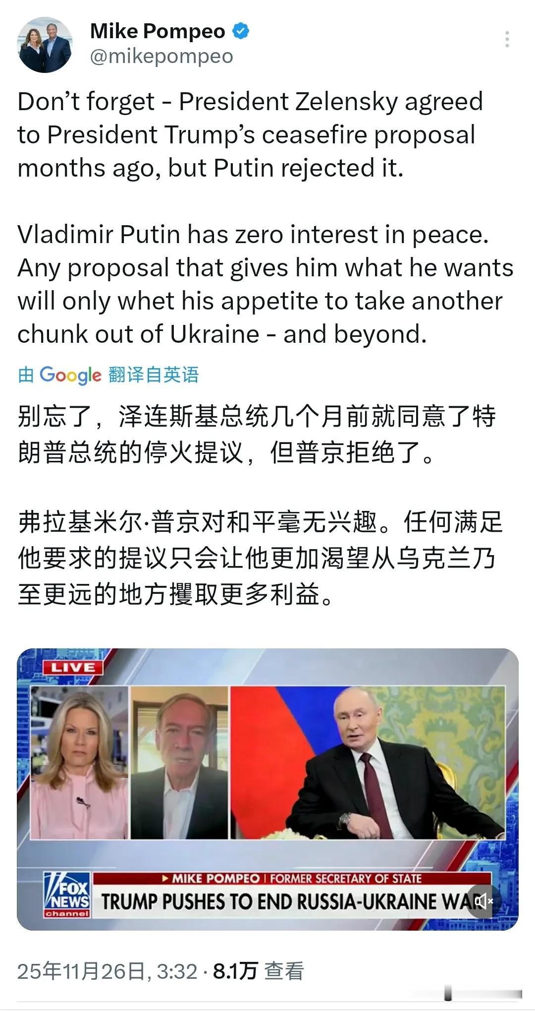 美国前国务卿蓬佩奥今天(北京时间11月26日)写道:“别忘了,泽连斯基总统几个月前就同意了特朗普总统的停火提议,但普京拒绝了。弗拉基米尔·普京对和平毫无兴趣。任何满足他要求的提议只会让他更加渴望从乌克兰乃至更远的地方攫取更多利益。” 评几句 蓬佩奥的这段话,是典型“美式政治喊话”:把一场持续近三年的代理人战争,压缩成一句“普京拒绝和平”,既轻巧地抹去了北约东扩、明斯克协议被乌克兰当缓兵之计等前史,也替美国自己摘了个干净——好像华盛顿源源不断送武器、送情报、送贷款,与“和平”毫不冲突。 更妙的是,他把时间锚定在“特朗普的提议”,既给共和党候选人递了“我曾有解”的竞选梗,又把当下僵局全部钉在普京身上,一举两得。 然而现实是,战场节奏从来不由推特声明决定;把复杂的地缘博弈简化为“好人不同意、坏人拒绝”的童话,除了继续给乌克兰人灌政治鸡汤,让欧洲多买美国 LNG,对美国政客的支持率有百利,对战火中的乌克兰却无一毫实际帮助。