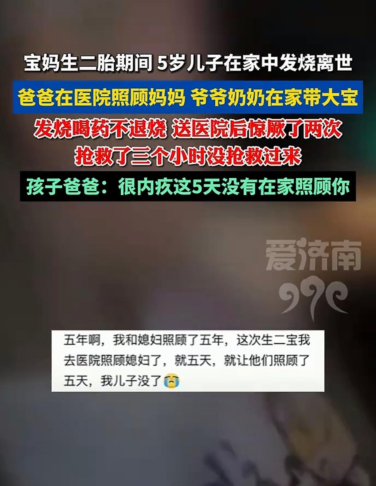 刷到这个视频的时候心里好难过,妈妈去生二胎了,爸爸去医院照顾妈妈时,五岁的儿子在家中发烧离世。 大宝是和爷爷奶奶在家的,很多老人都觉得小孩子发烧没什么大不了的,扛一扛就过去了,没想到出了意外。 秋冬季节,正是甲流的高发期,甲流≠普通感冒,甲流和普通感冒比,来得更猛、症状更重,甲流常突发39℃以上高热,还会伴随肌肉酸痛、乏力、畏寒,部分孩子会出现恶心呕吐、腿疼、肚子疼等症状,容易被家长误判。 儿童因免疫系统尚未发育成熟,成为感染“重灾区”,部分患儿病情进展较快,需警惕重症风险,这个事情发生了也给各位家长提个醒,儿童发烧一定要重视及时送医院,不要让悲剧重演。(图片来源于网络侵删)