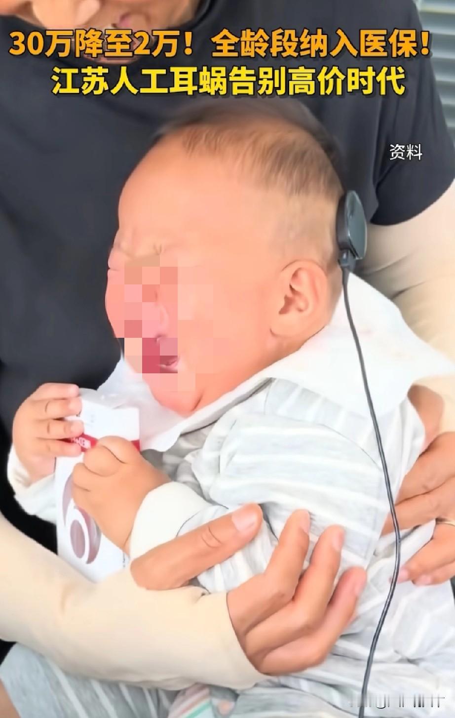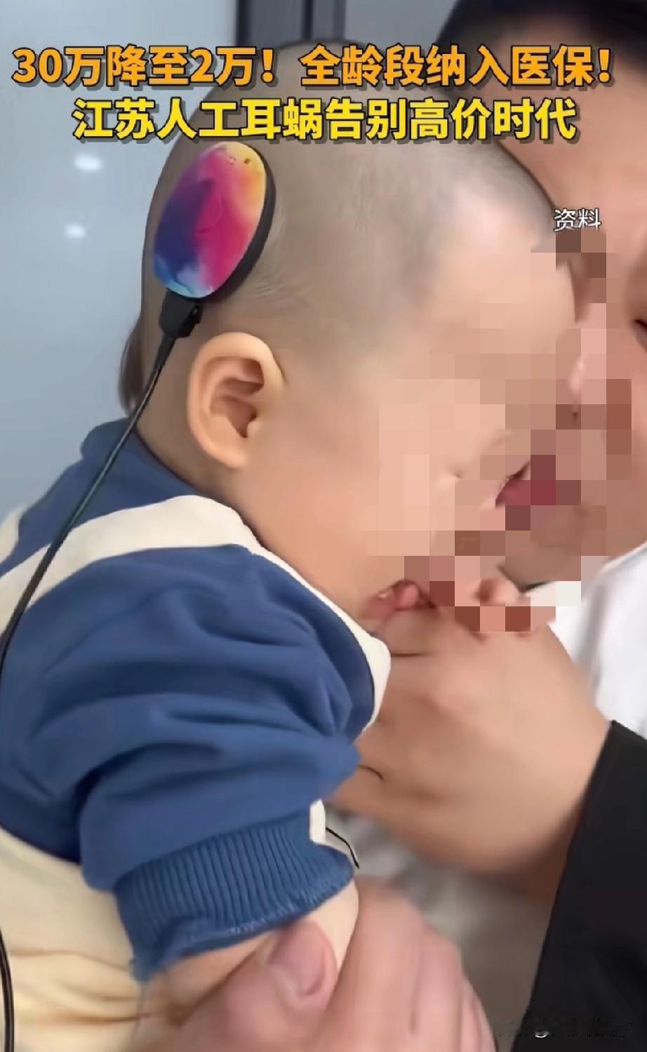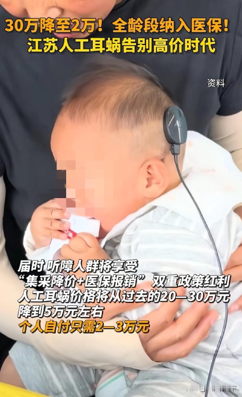 江苏省的这项政策,应该会让很多失聪孩童家长泪流满面 新华日报,南通广播电视台等媒体的报道,让很多人非常感慨,江苏省医保局出台规定,今年12月1号开始,人工耳蜗纳入医保支付范围,30万元降为2万元,全年龄段纳入医保,个人支付只需要2-3万元。 这个新闻,失聪孩童的家长们应该会泪流满面,毕竟孩子可以倾听到世界的声音,这是多么美好的事情。 每个孩子都有平等享受美好的权力,但是失聪孩童的世界,一直都是无声的,高价人工耳蜗,通过医保报销后,普通老百姓家庭可以接受的价格,对于一个家庭来说,简直就是天大的喜事。人工耳蜗费用 耳蜗手术政策
